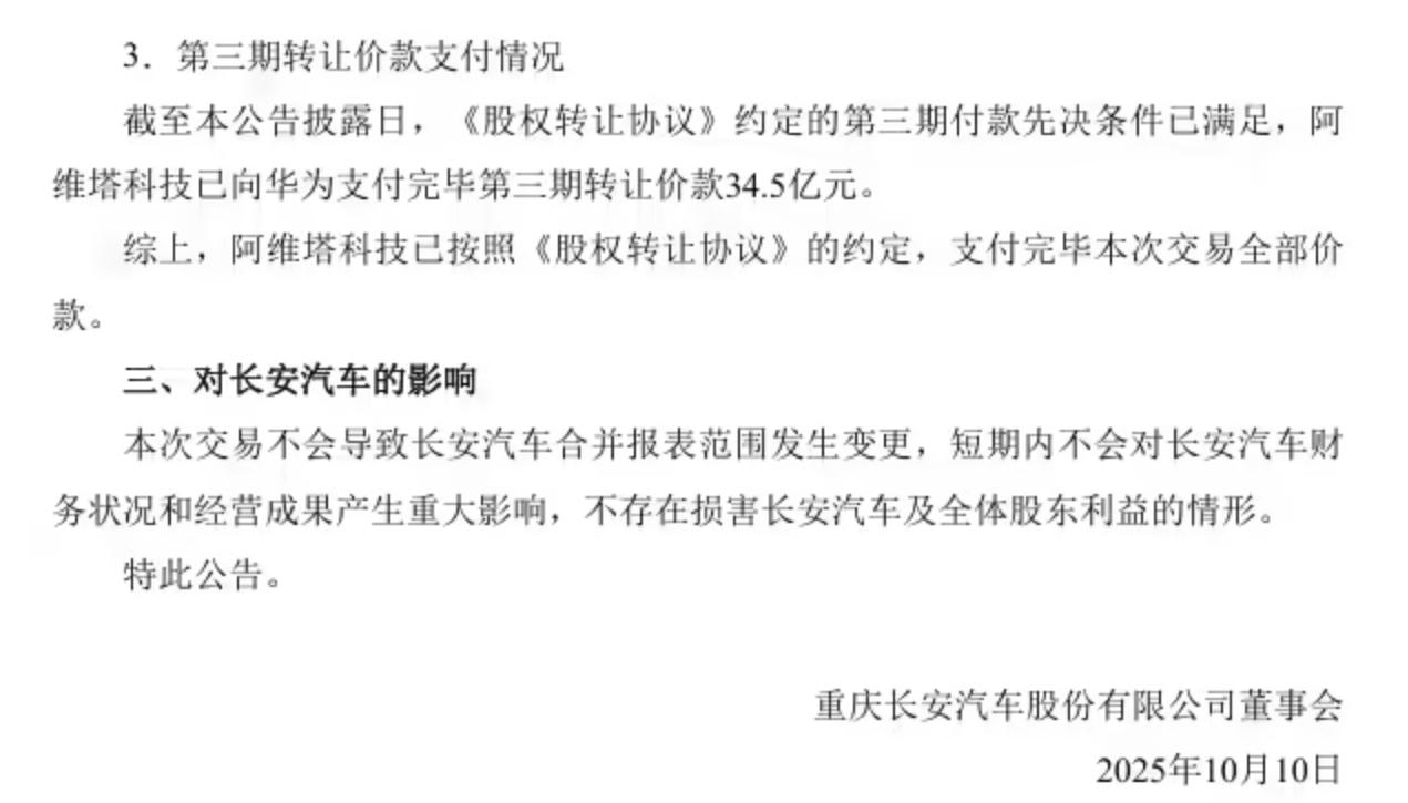 115亿投资支付已完成!就在10月9日,长安汽车一则公告引发行业关注:阿维塔与华为《股权转让协议》第三期付款先决条件达成。 已经顺利支付34.5亿元,至此累计支付115亿元,而这也就意味着阿维塔完成对华为引望公司10%股权的收购,双方在资本层面实现深度绑定。其实在这两年以来,华为就和阿维塔密切合作,今年9月,阿维塔战略2.0发布,双方合作进一步深化,在用户洞察、产品策略等多业务链条上达成“一个团队、一个目标”的融合模式。 而且还预料到2030年,双方将联合推出17款涵盖多细分领域的产品,其中5款升级车型将于2026年面世,着实让人期待啊。阿维塔完成向华为115亿元投资款支付 阿维塔向华为支付115亿