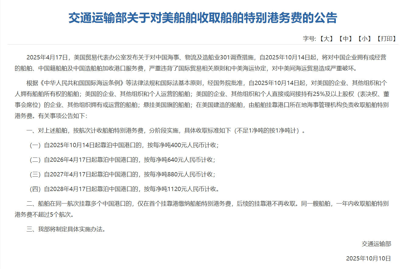 【交通运输部:#对美国船舶收取特别港务费#】2025年4月17日,美国贸易代表办公室发布关于对中国海事、物流及造船业301调查措施,自2025年10月14日起,将对中国企业拥有或经营的船舶、中国籍船舶及中国造船舶加收港口服务费,严重违背了国际贸易相关原则和中美海运协定,对中美间海运贸易造成严重破坏。