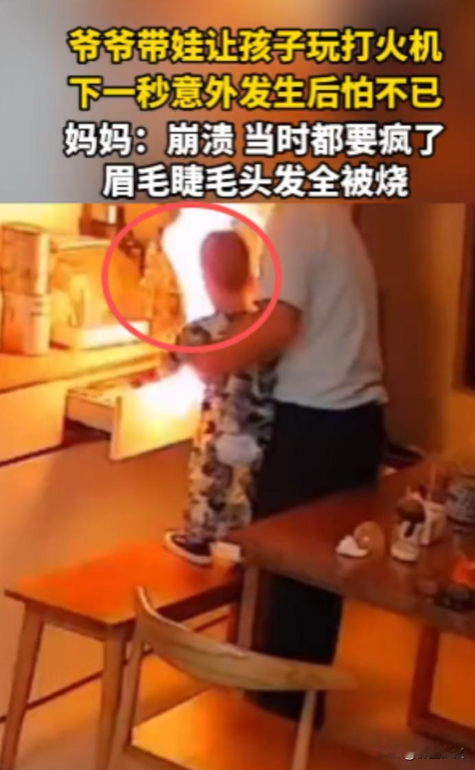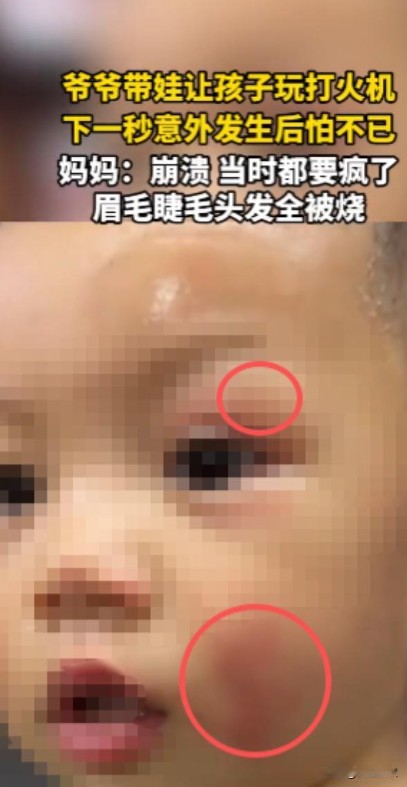 “悲剧还是发生了!”10月9日,湖南,一爷爷在家带孩子时给他玩打火机,下一秒打火机突然窜出巨大的火苗,孩子的眉毛睫毛头发全部被点着,脸上的皮肤也被烧伤,网友:不能让粗心的老人带孩子! 10 月 9 号那天,湖南一个普通的家里,本来跟平时没两样,爷爷在家看着刚会坐的小孙孙,孩子乖乖坐在专属的小凳子上,手里攥着个小玩偶,时不时咿咿呀呀跟爷爷搭话,爷爷怕孩子坐久了无聊,就想着找个新鲜玩意儿逗逗他,转身就去客厅抽屉里翻找。 抽屉里杂七杂八的东西不少,他随手摸出个银色的打火机,掂量了两下,在爷爷眼里,这小东西算不上啥危险物件,按一下能出火星、还能听见 “咔嗒” 声,说不定能吸引孩子的注意力,让孩子安分一会儿。 他压根没琢磨过,这玩意儿要是被孩子摆弄,可能会出啥岔子,就这么大大咧咧地把打火机递到了孩子手里,还笑着指了指开关的位置,示意孩子试试。 可谁能想到悲剧还是发生了!孩子的小手本来就没轻没重,拿到打火机后,好奇地抠着上面的按钮,一下就按了下去。 这打火机不知道是放久了有点故障,还是气压不稳,没像平时那样只冒出细细的小火星,反而 “呼” 的一下窜出一大团火苗,橘红色的火舌一下子就扑到了孩子脸上,孩子坐着的小凳子离手就那么近,火苗离脸撑死了也就十厘米,根本没给人反应的时间。 眨眼的功夫,孩子的眉毛、睫毛就被火苗燎没了,前额的一小撮头发也烧得卷了起来,冒着淡淡的青烟,更让人揪心的是,孩子的半边脸,从脸颊到眼皮,瞬间就红了一片,有的地方甚至能看出轻微的水泡,孩子疼得 “哇” 一声大哭起来,小手乱挥着想把火弄掉,可越慌越没章法。 爷爷当时就懵了,脑子里一片空白,下意识地一把抢过孩子手里的打火机,随手扔到了地上,又赶紧用手去拍孩子头上的火星。 可火虽然很快就灭了,孩子脸上的伤已经实实在在留下了,那红肿的皮肤看着就疼,孩子哭得撕心裂肺,爷爷也慌得手足无措,嘴里不停念叨着 “都怪我,都怪我”,却不知道该先做什么。 后来孩子妈妈下班回家,一进门就看见孩子哭个不停,半边脸又红又肿,赶紧问爷爷咋回事,爷爷支支吾吾说不清楚,妈妈赶紧调出家里的监控,一看完整的过程,当场就崩溃了。 镜头里清清楚楚拍着爷爷把打火机递给孩子,拍着火苗窜出来的瞬间,拍着孩子疼得直哭的样子,她心疼得抱着孩子也跟着哭,又气又急,却也没法真怪到爷爷头上,毕竟爷爷也不是故意的。 这事儿被发到网上后,很快就引起了热议,网友们看了都特别揪心,评论区里一片指责声,好多人说 “不能让粗心的老人带孩子!”“打火机这种危险品,怎么能给小孩玩?” 还有人说爷爷太不负责任,根本没把孩子的安全当回事。 其实平心而论爷爷也不是狠心,他就是没意识到打火机的危险性,觉得 “以前自己带孩子也没这么多讲究”,这种想法在老一辈里挺常见的,他们眼里的 “安全”,可能就是别让孩子摔着、饿着,却忽略了这些日常用品里藏着的风险。 就像这个打火机,在大人手里是点烟的工具,在孩子手里就是随时可能引爆的 “小炸弹”,可爷爷没看透这层,才让悲剧找上了门。 (信息来源:《爷爷带娃让孩子玩打火机,下一秒意外发生,妈妈:当时都要疯了》观象视频)