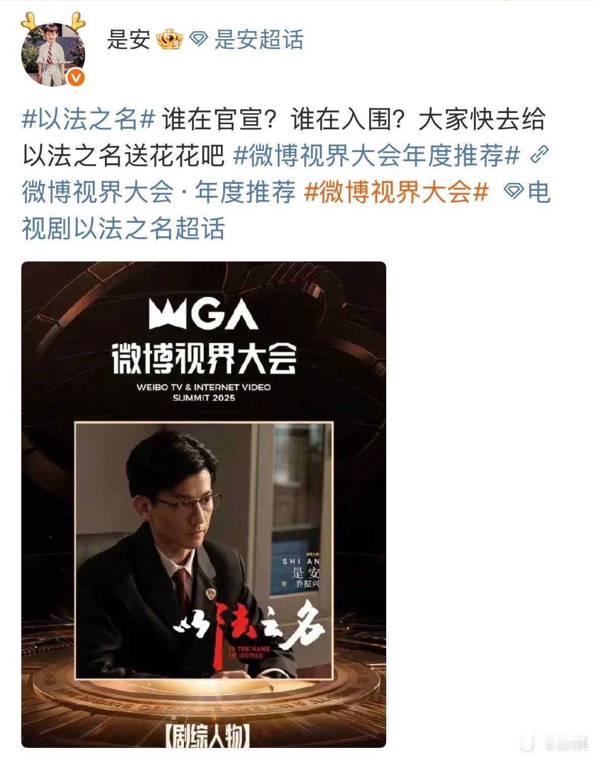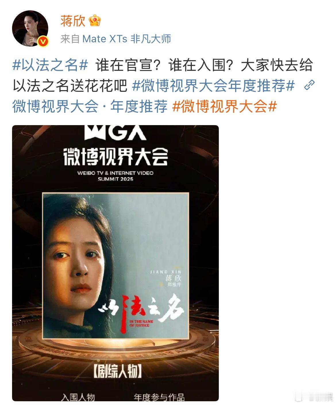 谁在官宣谁在入围微博视界大会年度推荐出炉啦!恭喜《以法之名》入围!与此同时,蒋
