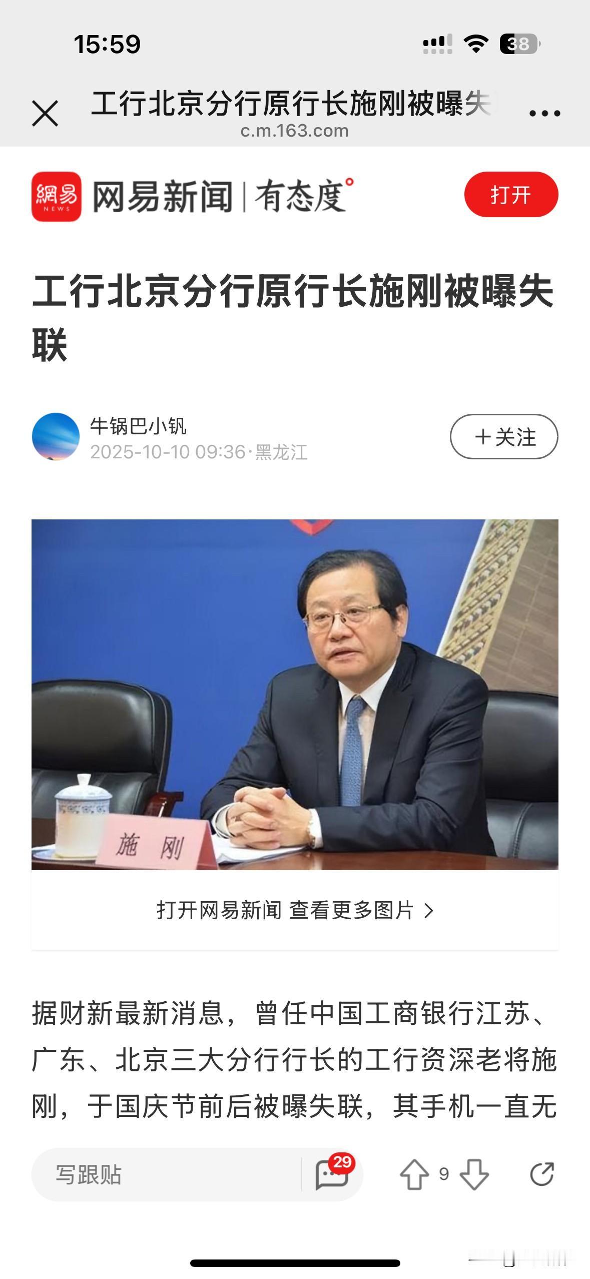据财新最新消息,曾任中国工商银行江苏、广东、北京三大分行行长的工行资深老将施刚,于国庆节前后被曝失联,其手机一直无人接听。 曾经的同事突然发了这个消息给我,看完无语,回了一句,世事无常啊! 浊气的归大地,清气才真的向上吧!