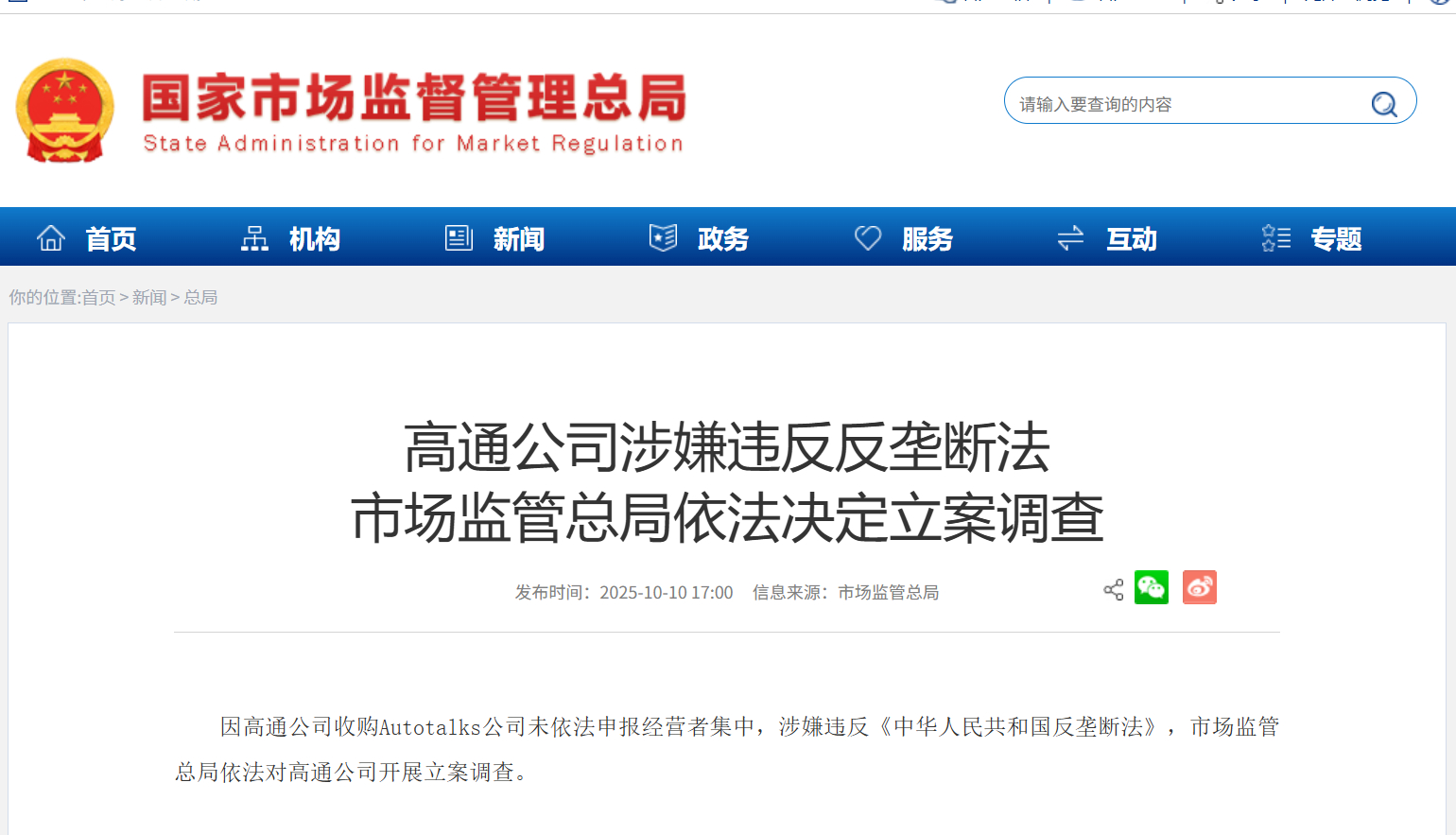 #市场监管总局依法对高通立案调查#【高通公司涉嫌违反反垄断法 市场监管总局依法决定立案调查】因高通公司收购Autotalks公司未依法申报经营者集中,涉嫌违反《中华人民共和国反垄断法》,市场监管总局依法对高通公司开展立案调查。#高通公司被查#