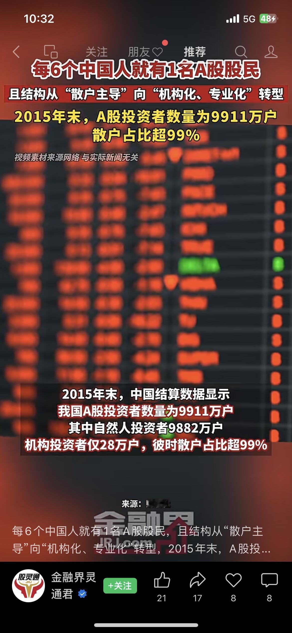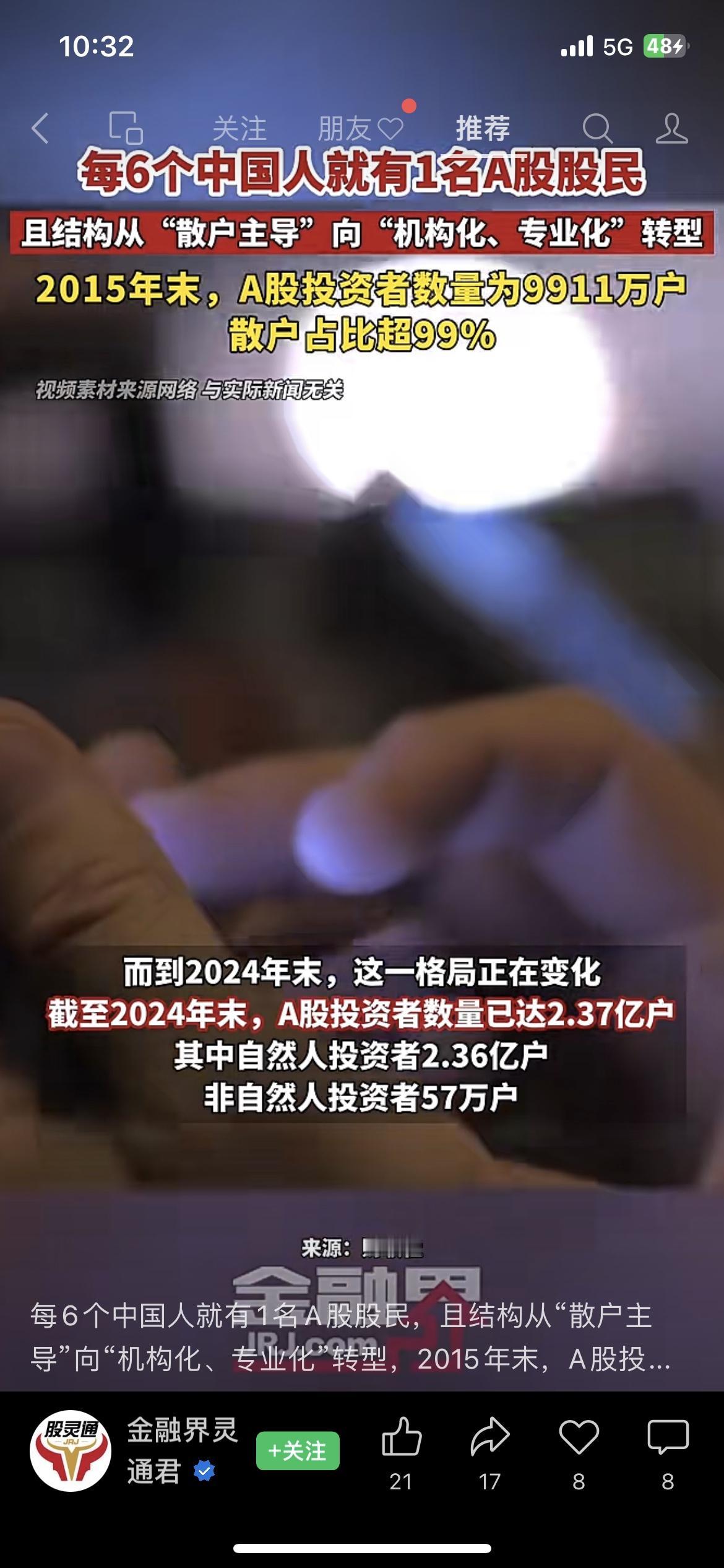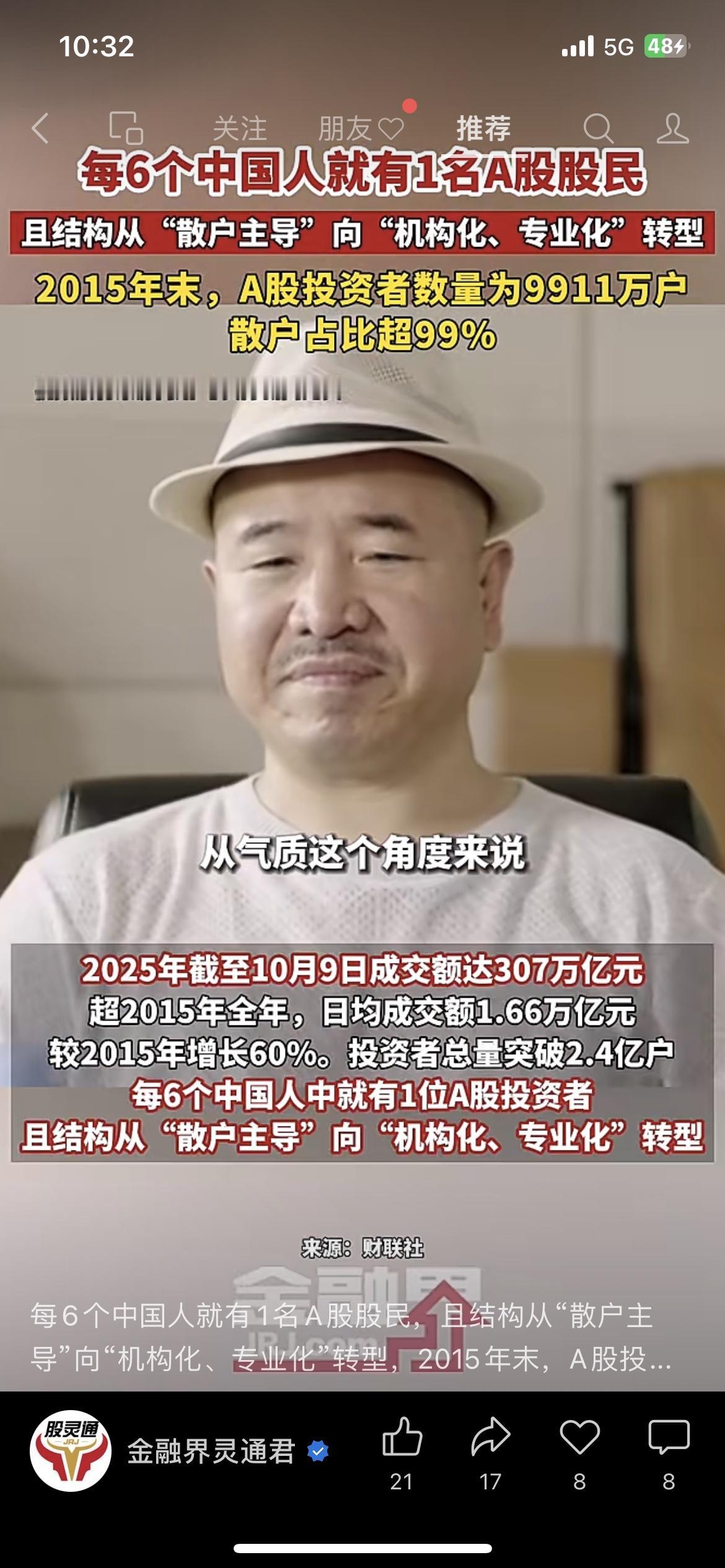 每6个中国人就有1个A股股民!市场从散户主导变机构化,你在其中吗? 家人们,A股股民数量也太猛了!现在每6个中国人里就有1个A股股民,投资者总量突破2.4亿户了。 遥想2015年,散户占比超99%,如今市场正从“散户主导”往“机构化、专业化”A股散户 中国股票市值 全球股民 转型。A股总市值也冲破百万亿,上市公司数量从2808家涨到5167家,快翻倍了。 你是A股股民不?觉得这种机构化转型对你炒股有啥影响?快来评论区唠唠!