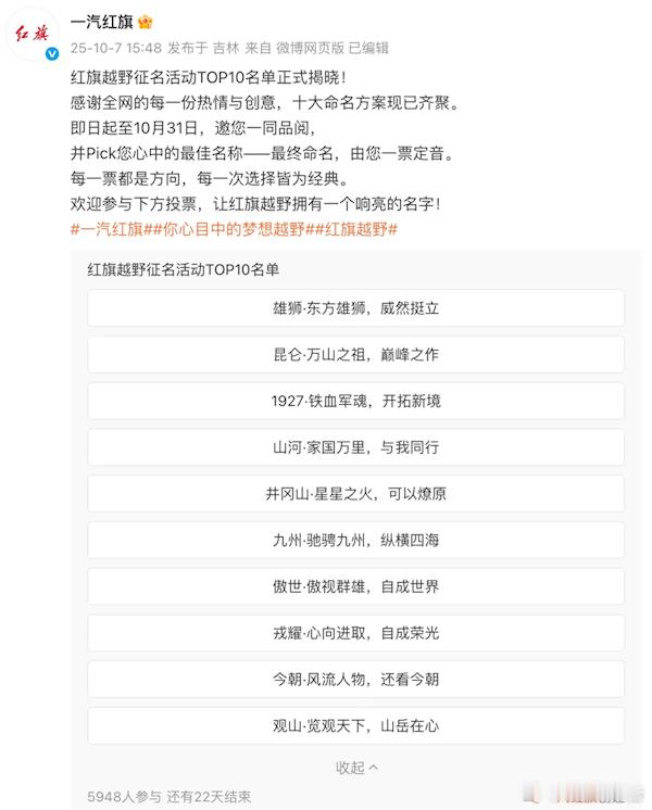 10月10日,一汽红旗官宣,红旗越野正式命名将于2025年广州车展正式公布。红旗越野已开启征名活动,后经过重重筛选,目前征名活动TOP10名单已经公布,分别为雄狮、昆仑、1927、山河、井冈山、九州、傲世、戎耀、今朝、观山。