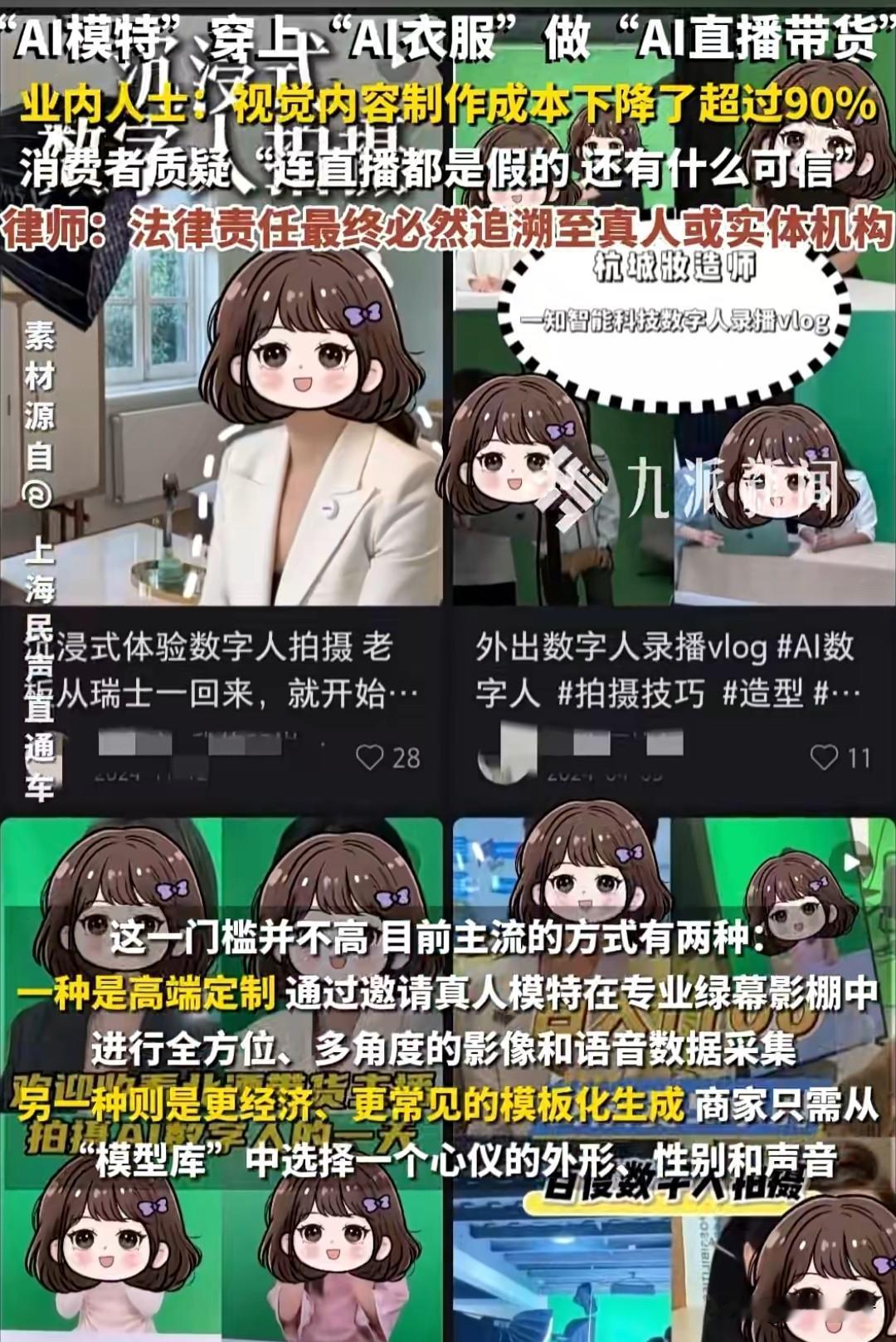 AI卷疯了!连模特/衣服/直播全是AI,带货变“造货”? 我认为现在直播带货已经卷到“无人化”了!AI模特穿AI生成的衣服,在AI搭建的场景里卖货,全程不用真人出镜,这波操作直接刷新认知! 👉 这波“全AI带货”有多离谱? ① AI模特:不用化妆不用休息,能切换高矮胖瘦、风格妆容,还能按需求调整动作表情,一天24小时直播不重样 ②AI衣服:设计师出个概念图,AI就能生成不同面料、配色的成衣效果,甚至能模拟穿搭在不同身材上的样子,省了打版成本 ③AI直播:自动讲解衣服细节、回答常见问题,还能根据观众评论调整话术,连优惠活动播报都精准到秒 ✨ 优势很明显,但坑也不少 ①优点:成本低(不用付模特/主播工资、省服装制作费)、效率高(快速试款+超长直播)、灵活度高(随时换风格换品) ②缺点:实物和AI图差距大(AI美化过度,面料质感、版型容易“货不对板”)、互动感弱(AI难应对突发问题,缺乏真人温度) 我觉得现在已经有不少快消品牌试水,尤其是卖服饰、配饰的店铺,用AI直播打“性价比”牌。但买过的人吐槽:“AI图里衣服是仙裙,收到货像麻袋”… 你们会买AI模特带货的衣服吗?觉得这种模式能长久吗👇