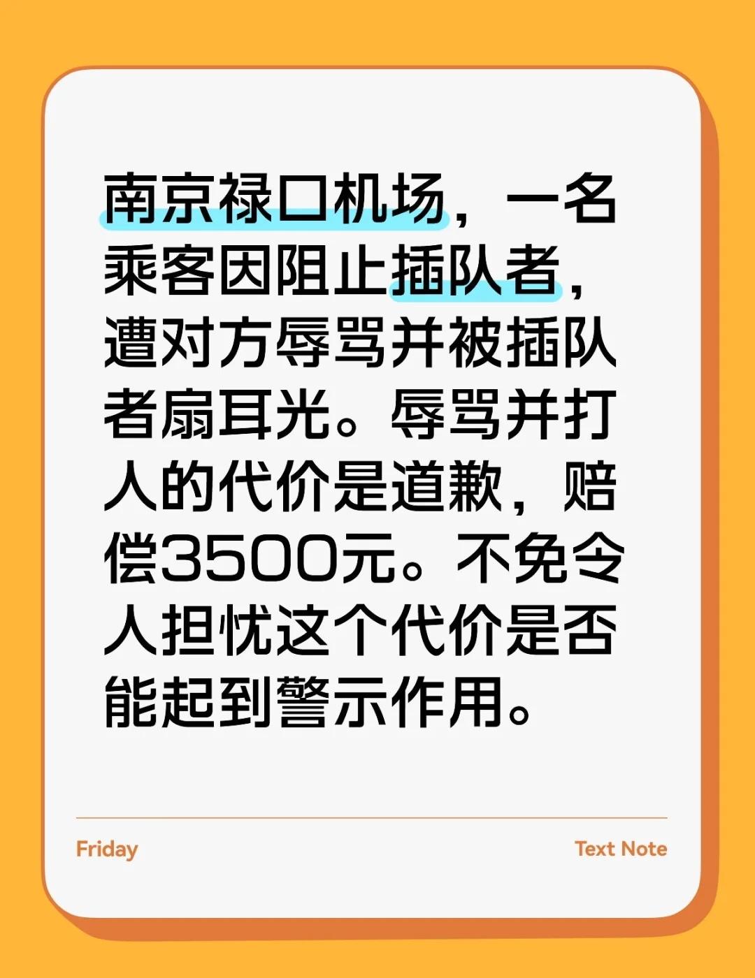 禄口机场插队者扇他人耳光,赔偿3500元 南京禄口机场,一名乘客因阻止插队者,遭对方辱骂并被插队者扇耳光。辱骂并打人的代价是道歉,赔偿3500元。不免令人担忧这个代价是否能起到警示作用。必须严惩坏人 总会遇到有些没有素质的人 禄口机场扇耳光事件