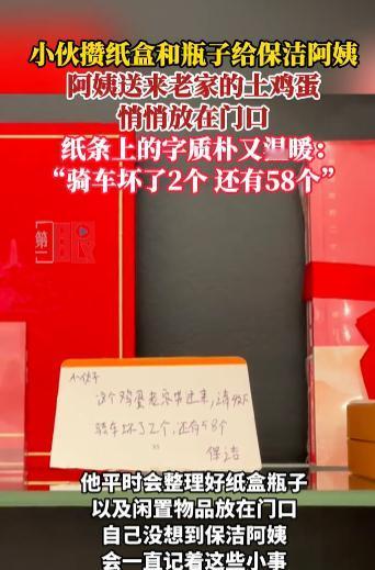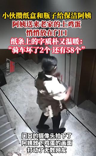 “太有人情味了!”10月8日,江苏南京,一男子平时攒纸壳和塑料瓶送给保洁阿姨,过节时保洁阿姨将老家的土鸡蛋悄悄放到男子门口,还留下亲手写的纸条,说明骑车时鸡蛋坏了2个,还有58个,网友:人与人之间的感情都是相互的! 有时随手播撒的善意种子,可能会带来意想不到的收获,感情都是相互的,你对别人好,别人自然会对你好。 一男子平时会攒纸壳和饮料瓶子,在攒到一定数量后他会分类打包好放在门口送给保洁阿姨,平时用不到的闲置物品也会放门口。 国庆长假结束男子回到家时,竟然发现门口放着两袋子鸡蛋,这些鸡蛋大小均匀,都很干净一看品质就很好。 正当男子疑惑时,他瞥见袋子里有张手写的纸条,纸条上用质朴的字体写着这是家里带来的土鸡蛋,骑车时坏了2个还剩下98个,署名是保洁阿姨。 男子与阿姨已经认识三四年了,一直将其当成长辈对待,没想到自己平时做的这些小事保洁阿姨会一直记着,他十分感动,将这张纸条摆放在了家中的显眼处。 不少网友被男子和阿姨的温暖故事感动到了,人与人之间的感情有时很纯粹,这种纯粹像是一盏明灯照亮了世界。 信息来源:《小伙攒纸盒和瓶子给保洁阿姨,阿姨送来老家的土鸡蛋,悄悄放在门口,纸条上的字质朴又温暖》长江日报