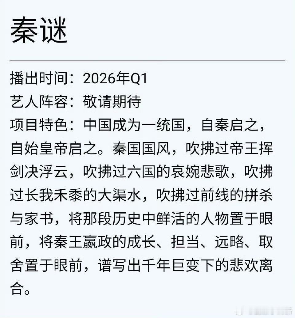 内娱男频剧上新 内娱又有男频剧上新了,《秦谜》直接点燃了我的期待值💥!网传10月开机!想看我们老祖宗如何用智慧和谋略,在乱世中杀出一条血路,最终加冕为皇。有陈晓很稳很安心,相信能把这个历史大剧的嬴政形象刻画得入木三分!可以一直相信陈晓的古装!秦谜