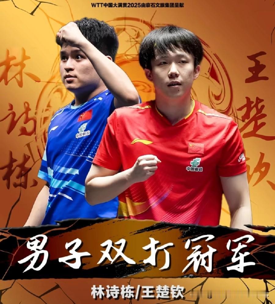 王楚钦九届大满贯赛共获得六次【男双】冠军,成绩也是非常出色的! 搭档林诗栋收获了2025中国大满贯、新加坡大满贯男双冠军! 搭档梁靖崑收获了2024中国大满贯男双冠军! 搭档马龙收获了2024沙特大满贯男双冠军! 搭档樊振东收获了2022、2023新加坡大满贯男双冠军! 不同的搭档却是相同的结果! 另外三个男双冠军分别是: 林高远/马龙获得了2024新加坡大满贯男双冠军! 黄镇廷/陈颢桦获得了2025瑞典大满贯男双冠军! 韩国组合林仲勋/安宰贤获得了美国大满贯男双冠军!