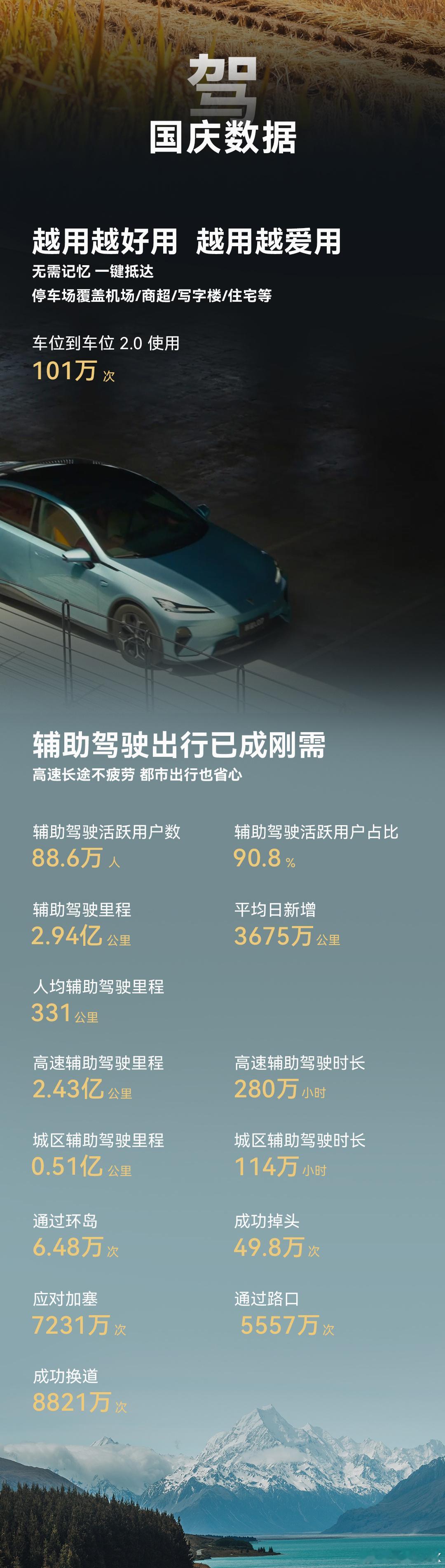 国庆8天假期,华为乾崑辅助驾驶跑了2.94亿公里,人均331公里,相当于每天一个马拉松,PS:其中我也贡献了500多公里。还有个比较有意思的数据,华为乾崑累计辅助驾驶总里程达54.24亿公里,超过了理想的53.4亿公里。我始终觉得功能好用,用户才爱用,而且华为乾崑常用常新,越用越好用,国庆前推送的华为乾崑ADS 4就是一个例子。报告里华为乾崑车位到车位2.0功能被使用了101万次,智慧语音被唤醒超8800万次,避免可能的碰撞7.48万次,再加上近百万次的泊车数据等等,再次说明华为乾崑领先,怪不得现在不少车企都和乾崑合作,用户信赖的智驾第一品牌,不服不行。