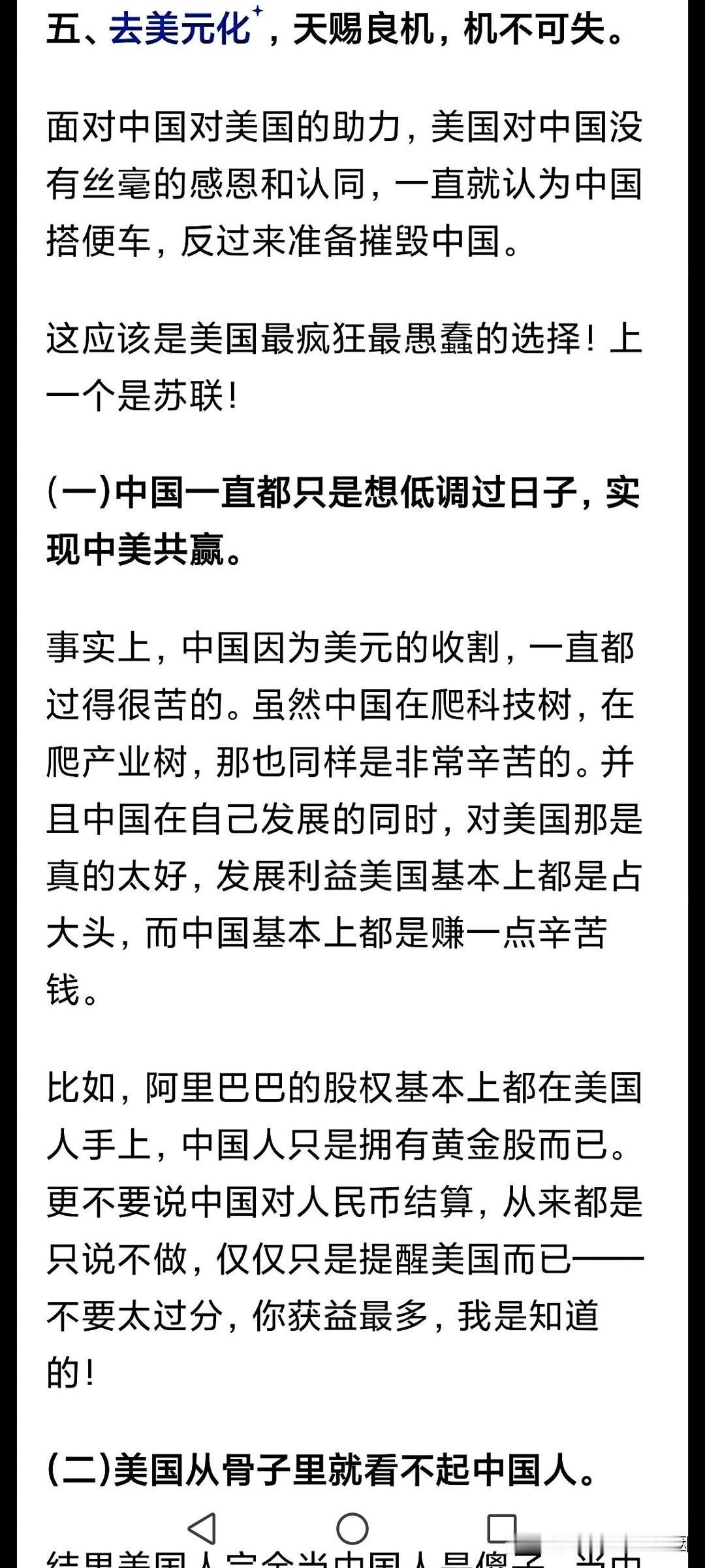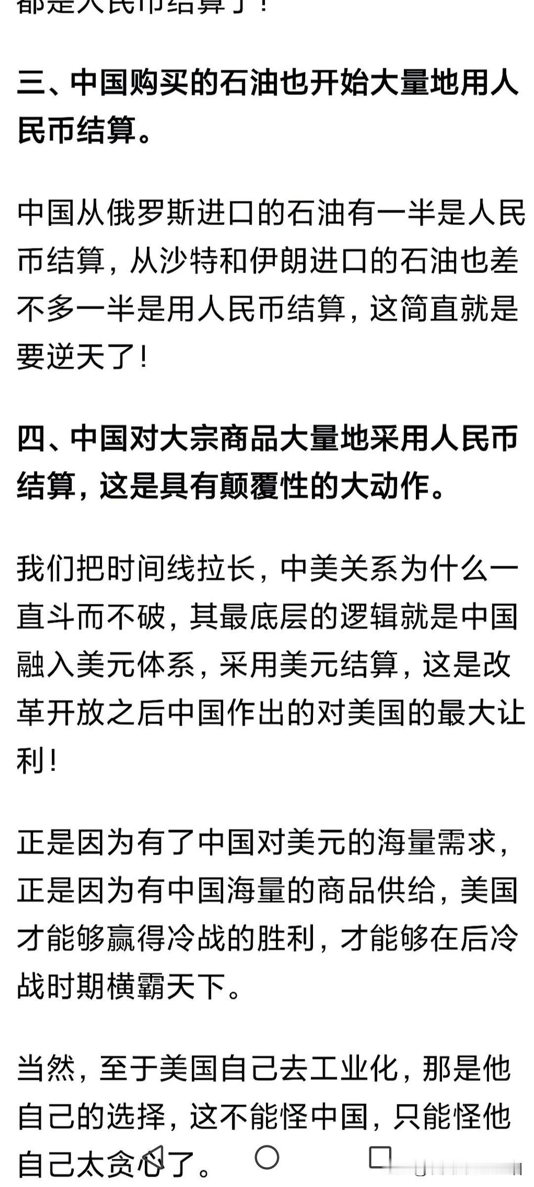 停购美国大豆是第一步, 停购澳洲铁矿是第二步, 购买石油人民币是第三步, 完全去美元化是第四步! 大家可以看到,川普一直闹腾着要过来访问,但是一直没来,因为谈不拢,来了也白来。至少能够前期谈的差不多有进展再来,那还好一些,现在没有进展的谈判,斗争不会停下来。 美国大豆自己留着,巴西和阿根廷大豆也不错。澳洲铁矿接受人民币的概率很大。所以当前的世界,似乎到了一个拐点,就是慢慢完成脱钩。 不是咱们要脱钩,是美国一直叫嚣着脱钩,咱们不得不防。实际上必须做到从从容容,游刃有余,要不然就是匆匆忙忙,连滚带爬。有了之前多年的摸爬滚打,现在即使立刻脱钩,也不至于伤及根本,还能承受的住。 这个世界本就是这样,美国从来都是霸道,不经历一系列的斗争,也得不到足够的尊重,东升西落已经成为必然!