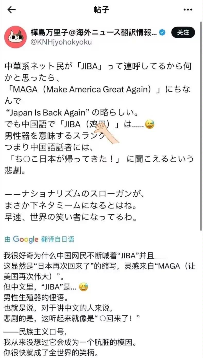 哈哈哈,日本人终于发现高市早苗口号“Japan Is Back Again”(日本回来了/日本重回巅峰),英文缩写JIBA得邪恶含义了……烽火问鼎计划