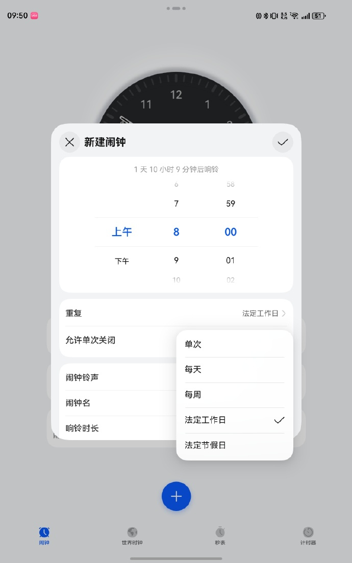 尊贵的iPhone 17机主们记得定闹钟啊,明天工作日,安卓和鸿蒙用户们不用担心,你们可以设置法定节假日/工作日的。