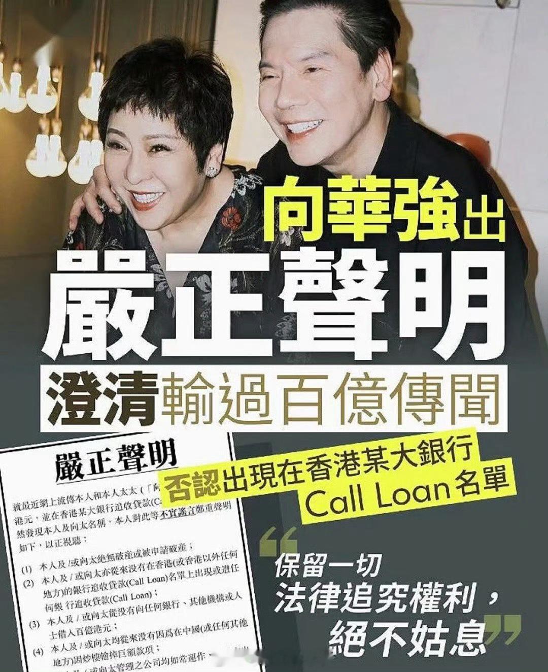 向发强发声明否认破产传闻 向华强夫妇通过香港媒体严正声明,直接否认“破产”“百亿负债”等网络传言。核心就三点:没被追债、没借巨款、企业正常运转,还放话要追究造谣者。
