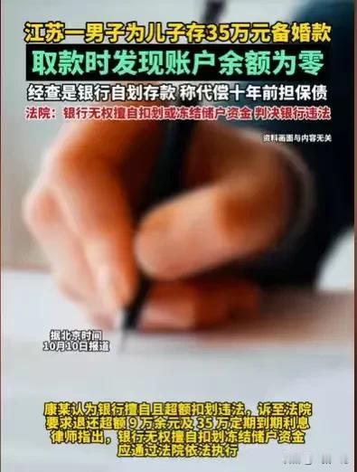 江苏如东,男子眼看儿子到了谈婚论嫁的年龄了,他赶紧存起一笔35万元,等儿子结婚的时候用,可等他来取款时,那35万不翼而飞了,男子一查,存款行擅自划扣了这一笔钱,其原因让男子大吃一惊,他无法接受。 在2024年,康某手上有一大笔钱,他可不敢乱花,他看着眼前的儿子,已经是谈婚论嫁的年纪了,只要一谈女朋友了,就要面临着结婚花钱。 如果儿子结婚,这一笔钱正好够儿子用,想到这里,康某赶紧将这一笔钱存起来,以备不时之需。 可没想到就是因为这个决定,给他带来了大麻烦。 自从他存了这一笔钱,他一直惦记着这一笔钱,终于他有事要把钱取出来了,这一笔钱终于也有了用武之地,他赶紧去取钱。 可当他来到柜台前,将卡和本子给了工作人员,工作人员在电脑前一查,却告诉他,他的卡里面没有钱。 康某一听,吓了一大跳,他可是存了35万那么多,钱怎么可能无缘无故没有了,他不相信,他觉得工作人员肯定是查错了,他让工作人员帮忙重新查一下,这到底是怎么一回事。 结果工作人员一查,发现的其中的大问题。 原来,这一笔钱就是存款行的工作人员划扣了的,他们为什么要划扣这一笔钱?。 事情要从2013年开始说起,那年康某和赵某的关系非常好,赵某有事要贷款20万周转。 他找到康某,那时康某有不错的工作,也有不错的收入,康某帮他担保是最好不过的。 当时康某也没想这么多,他觉得赵某也是个有能力的人,贷款出来的钱也会很快还上,所以他就帮忙做担保人了。 康某一直没有重视这件事情,他还以为,赵某早就将这一笔钱给还上了。 殊不知,这么多年过去了,赵某都没有还这一笔钱,即使强制执行,赵某也没有钱拿出来还。 而康某作为担保人,自然受此事影响,他本来就有连带责任,他是有帮忙还债的责任的。 既然赵某一直没有还这笔钱,康某正好又存了35万进去,所以存款行就擅自扣了这一笔款。 得知自己35万消失的原因,康某感到很不可思议,他这才知道自己干了一件大傻事,当初就不应该做担保人,现在自己的钱不见了,他得找赵某,他也不知道赵某是否能够拿钱出来。 对于存款行上次划扣了这35万,康某也是非常不能接受,更让他不能接受的是,明明赵某贷款的是20万,即使有利息存在,那也不应该划扣35万那么多。 康某查了一下,就算要划扣,也只是划扣26万左右,存款行多划扣了9万多元,这不合理。 于是他觉得存款行擅自划扣这35万存在违法行为,他不服气,就起诉了存款行,要求返还那9万多元,以及那35万的利息。 发生这样的事,康某确实也挺难受的,他不过是一个担保人,现在他的35万不见了,他肯定是着急的。 而且不但是康某不能理解,存款行为何要多划扣9万多元,很多人都不能理解,按理说,如果康某有连带责任,那么就应当划扣相应的钱,不应当多划扣那9万多元。 那么康某该怎么办呢? 首先,康某把钱存起来,与存款行是构成合同关系的。 《商业银行法》第29条规定:商业银行办理个人储蓄存款业务,应当遵循存款自愿、取款自由、存款有息、为存款人保密的原则。对个人储蓄存款,商业银行有权拒绝任何单位或者个人查询、冻结、扣划,但法律另有规定的除外。 存款行就算要划扣这一笔钱,也应当通知康某,他们有这个义务。 其次,存款行擅自划扣康某的35万,还超额划扣了9万多元,这已经构成了违约行为。 《民法典》第577条规定:当事人一方不履行合同义务或者履行合同义务不符合约定的,应当承担继续履行、采取补救措施或者赔偿损失等违约责任。 在本案中,康某和存款行有担保关系存在,如果贷款的钱,没有及时还清,他是要承担连带责任,进行还款的。 因此法院经过审理认为,存款行多划扣那9万多余元属于违约行为,应当返还超额部分的9万余元,并且赔偿35万的利息。 那么你对康某的这35万有何看法呢?
