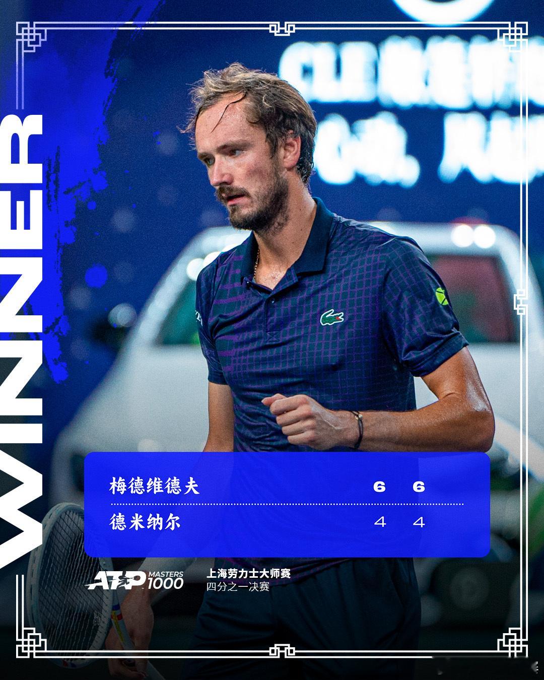 男单四分之一决赛,2019年赛会冠军、16号种子梅德维德夫6-4 6-4击败7号种子德米纳尔,将双方交手记录改写为8胜4负,打进生涯第61个巡回赛四强!他将和非种子球员林德克内西争夺决赛席位。