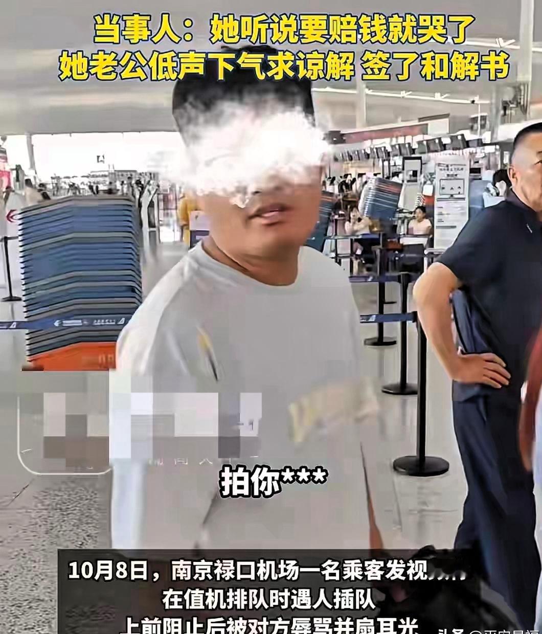 男子在南京机场被女子扇耳光后续,警方介入,女子听到赔钱被吓哭 国庆返程高峰,戴先生拖着行李箱规规矩矩排队值机,结果一家四口直接插到他前面,他就小声提醒了句“插队不对”,竟直接点燃了对方的火气。 打头的男子先劈头盖脸骂过来,接着一家四口全围上去,那阵仗像要动手打架。更过分的是个壮硕女子,抬手就给戴先生两耳光,直接把人扇倒在地,她父亲还趁乱拿行李箱撞戴先生的脚腕——这哪是赶飞机,分明是仗着人多欺负人! 报警后,这家人的态度180度大转弯。进了警务室就开始卖惨,哭着说“孩子爸得了癌症,花了十几万,实在急着赶飞机”,对打人的事绝口不提。 可当民警明确责任,说要赔3500元医疗费和530元高铁改签费,总共4030块,还要公开道歉时,刚才扇人时凶神恶煞的女子,当场嚎啕大哭,抱着民警的胳膊不肯放,她老公也凑过来低声下气求原谅,前后反差大到让人无语。 更气人的是,戴先生心软删了视频,没成想这女子转头就又开始骂骂咧咧。这哪是真没钱,分明是不想为自己的恶行负责!真以为“我急我有理”“人多能耍横”?规则面前没人能搞特殊,一时的蛮横,终究要付出代价。 你们在公共场合遇到过这种“插队还动手”的人吗?要是你遇到这种出尔反尔的情况,会轻易原谅对方吗?