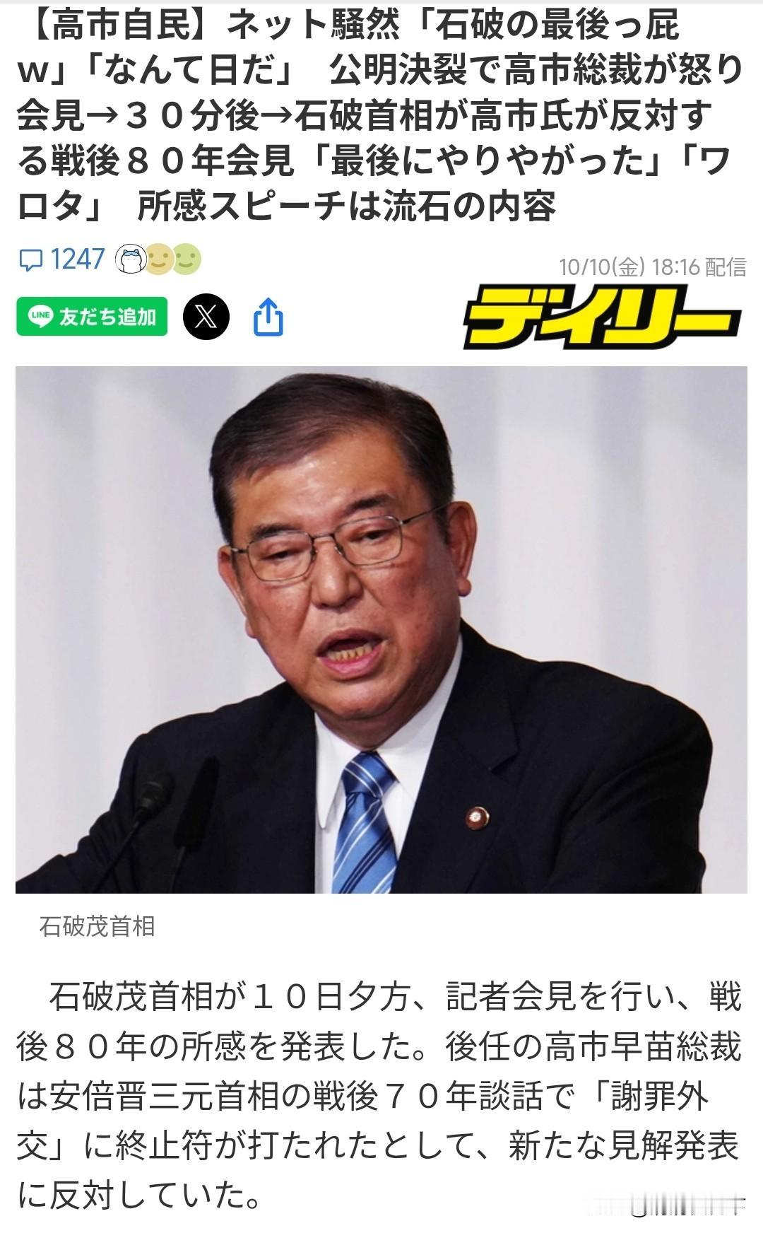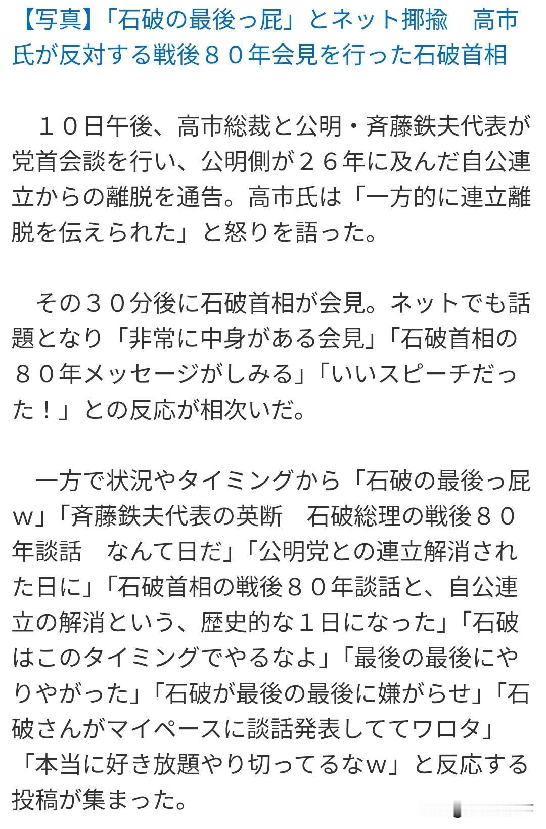 日本公明党突然割席,石破也来火上浇油, 今天的日本政局,好热闹啊! 晚上下了班看看新闻, 发现已经跟日本自民党联合执政多年的公明党党首斋藤铁夫代表,今天跟日本自民党新党首会谈,并向其通告要解除持续26年的自民党和公明党的联盟。 作为执政联盟老对儿的公明党,在这个时候选择放弃执政党身份来跟自民党割席,几乎等于是把高市早苗从要到手的日本首相之位给踹了下来! 煮熟的鸭子要飞啦! 在之后的记者会见中,高市怒斥公明党单方面告知要解除联盟。 在高市记者会见30分钟后,即将卸任的石破茂召开记者会,发表了被日本网民评价为“有内容”,“好演讲”,“可以看出石破先生对战后80年看法”的讲话。 石破在演讲中反对高市表示要终止“谢罪外交”的观点。他说:“这场大战为什么当时没有被阻止?” 他的这一做法,也被一些日本网民评价为 “石破最后的屁” “石破到最后也要让人讨厌呀!” “公明党斋藤铁夫的英明决断,石破的战后八十年讲话,这是怎样的一天呀!” “石破呀,你不要在这个时候干这个事呀” “最后的最后,他还是干了想干的事” ....... 2025年10月10日,也许将成为载入史册的一天!