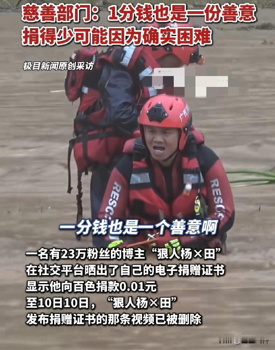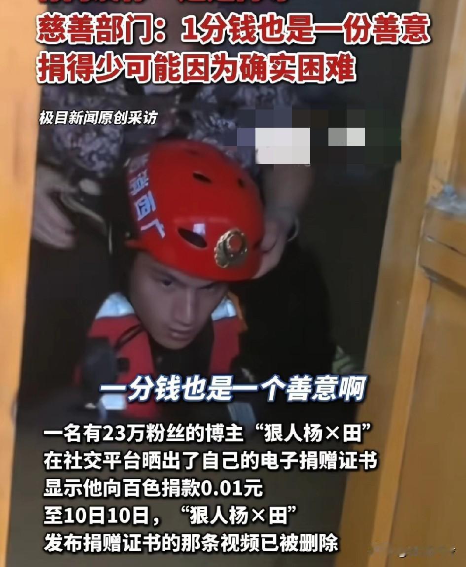 23万粉丝博主为百色抗洪捐1分钱,还特意在社交平台晒出了自己捐款一分的电子证书 一分?虽然说一分也是钱,但是不相信一块钱拿不出来。可能她想以这个方式红,捐一分难道不是侮辱吗?拼多多看广告赚的吧,有心要捐的人不会只给一分钱。平常人给0.01也就算了,作为网红主播给0.01就说不过去