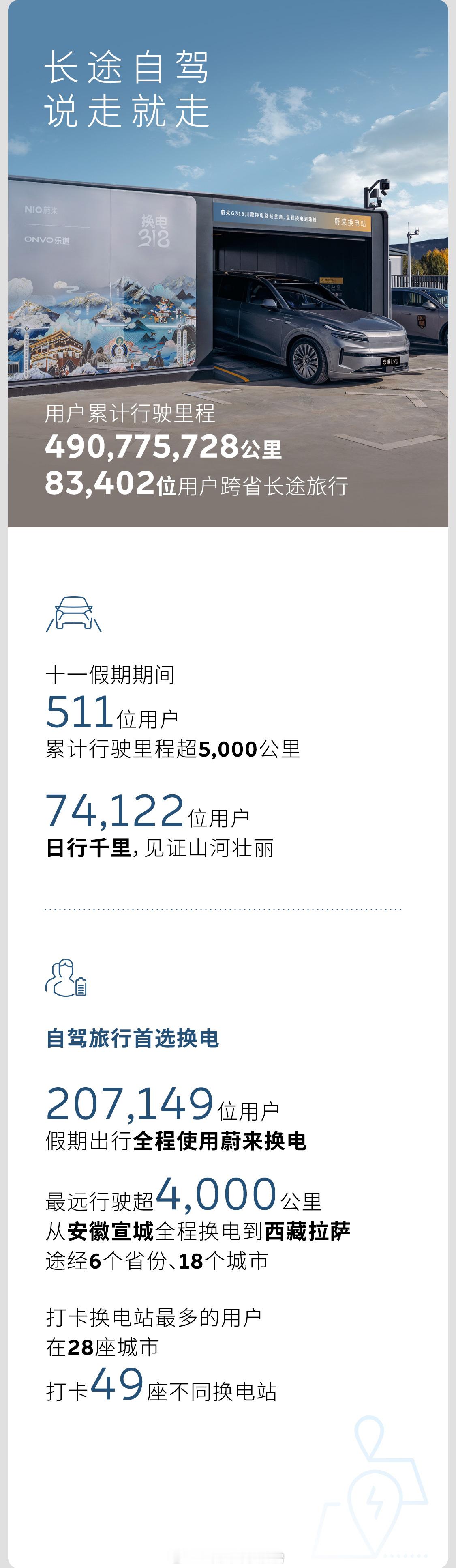 蔚来在2025年实现贯通的G318川藏换电路线,从成都至西藏定日县全程超过2950公里,共布局了15座换电站。从8月16日贯通至10月8日的50多天里,自驾进藏的蔚来及乐道用户数量相比去年同期增长了252%。