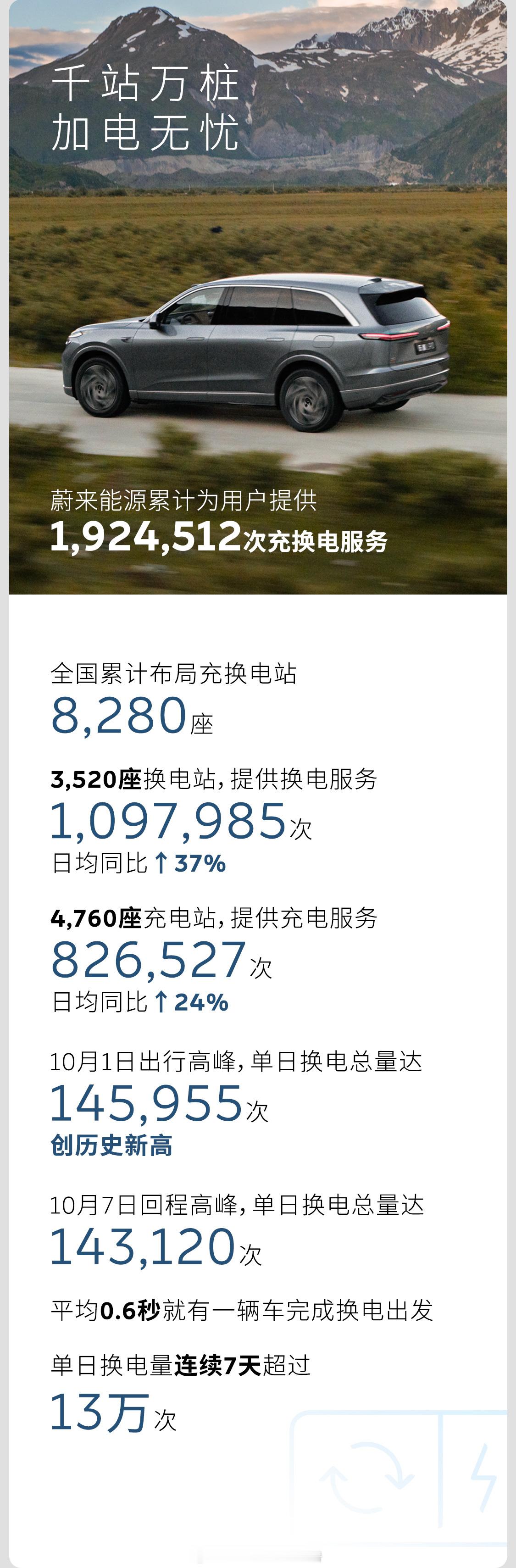 假期中,蔚来换电服务的单日峰值达到14.6万次,日均服务量维持在13.7万次,较2024年同期增长了37%。