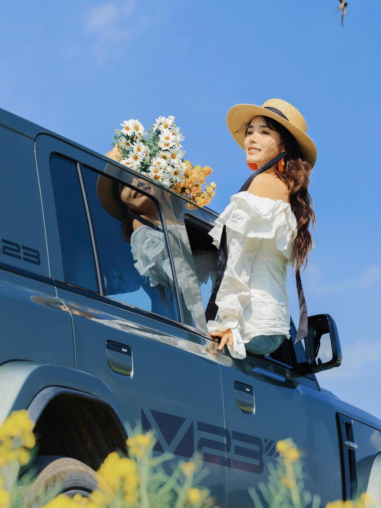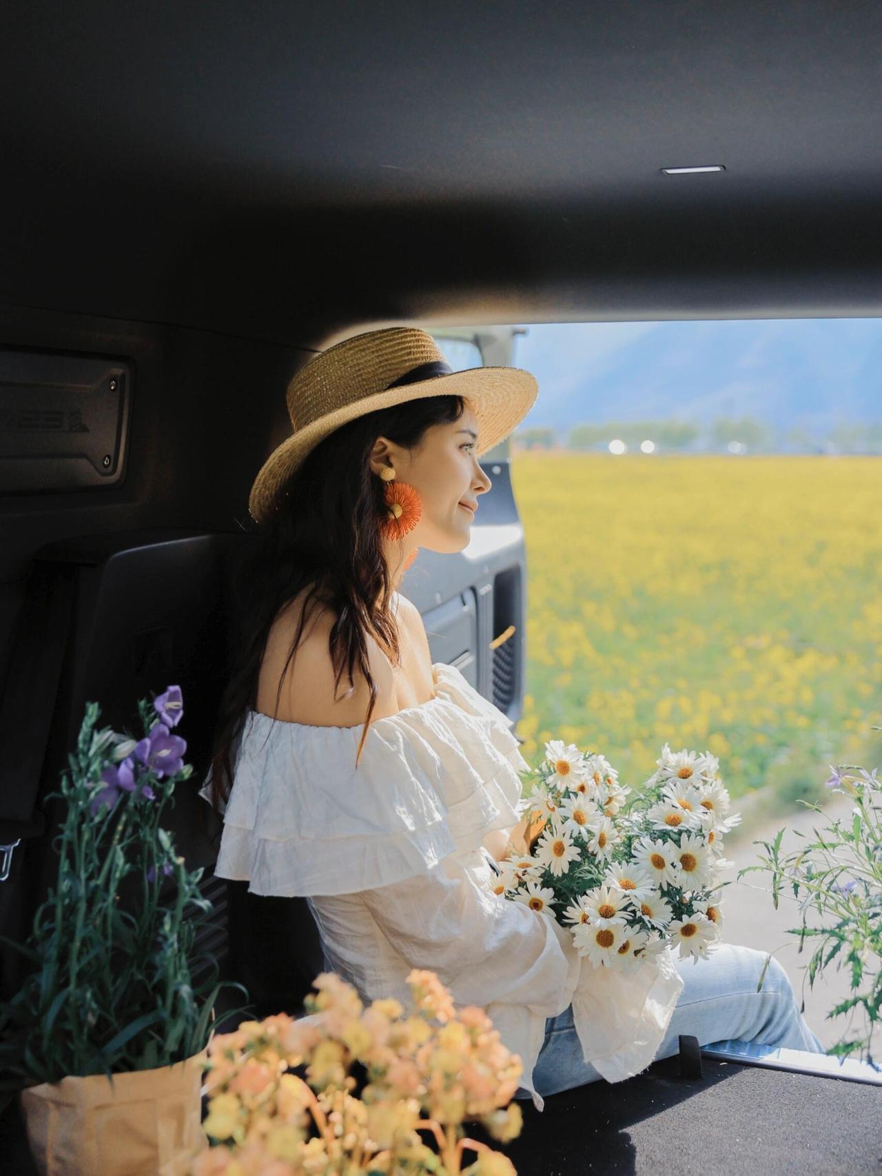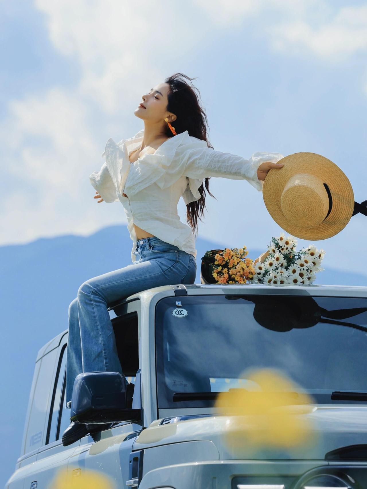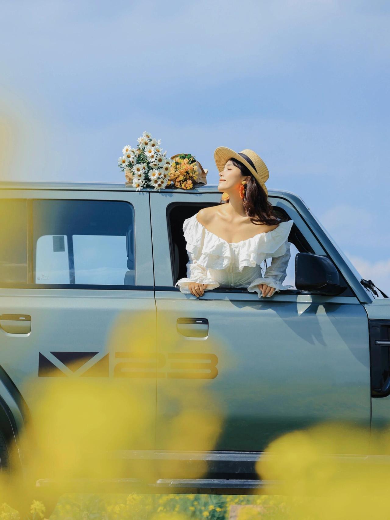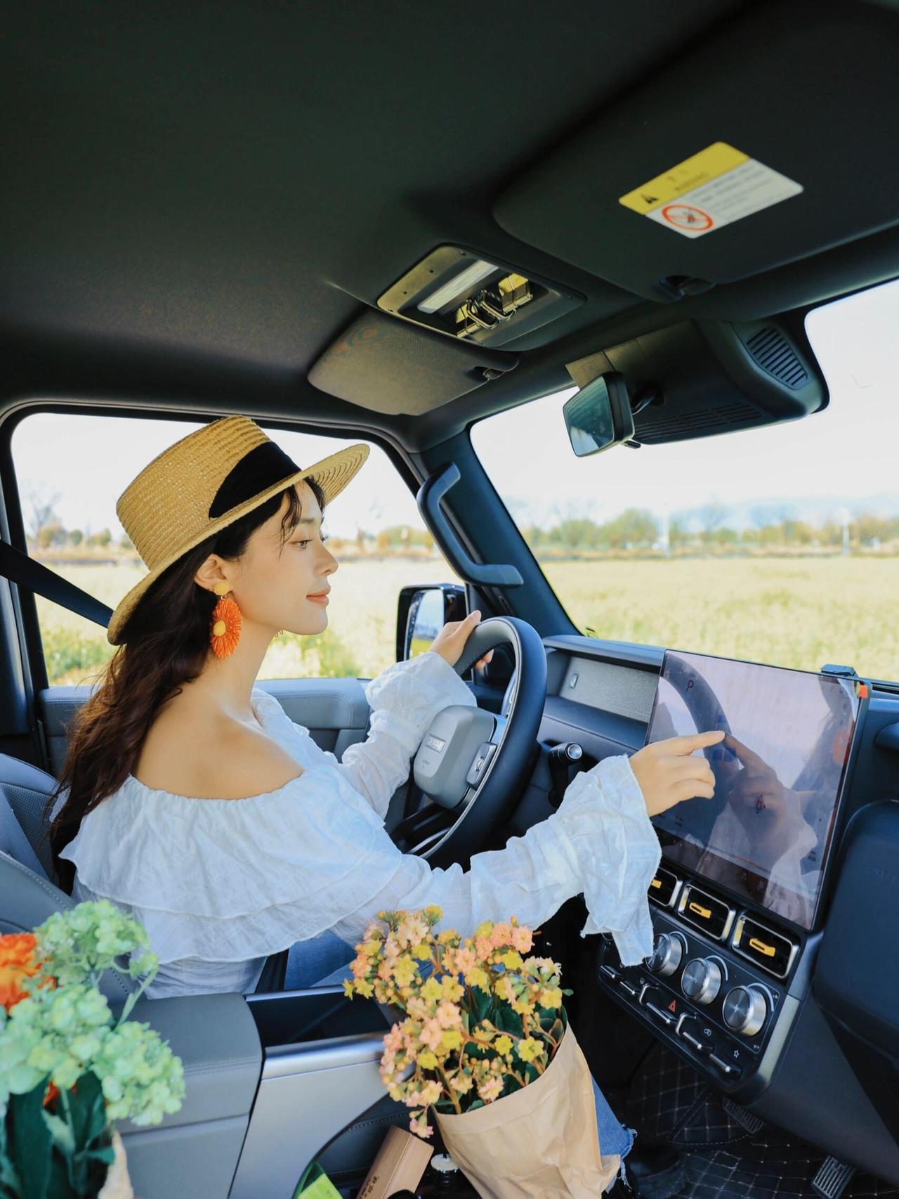 照片的惊艳之处在于风格的碰撞与融合。田园风的服饰、花艺元素,与硬派越野车的机械质感本是两个极端,却在摄影师的镜头下达成了奇妙的平衡。画面中,女性的柔美线条与车辆的硬朗轮廓形成视觉对比,而花海的柔和则成为两者之间的过渡带,让冲突感转化为独特的美学张力。 构图上的多视角切换是一大亮点:低角度拍摄人物与车辆的同框,凸显车辆的大气与人物的灵动;以花海为前景的虚化拍摄,让车辆与人物在朦胧中更具氛围感;车内视角的呈现,则拉近了观者与场景的距离,增强了画面的代入感。这种多角度的尝试,让一组照片拥有了丰富的视觉层次,避免了单调感。 情绪表达上,照片传递出“自由与浪漫并存”的生活态度。无论是在花海中肆意呼吸,还是驾驶爱车穿梭于自然,都在诠释一种“既能拥抱田园诗意,也能掌控机械力量”的现代女性形象,这种精神内核让画面超越了视觉美感,具备了更深层的情感共鸣。