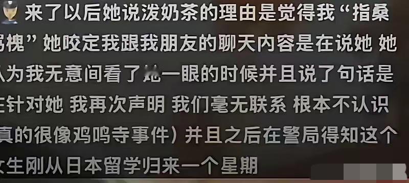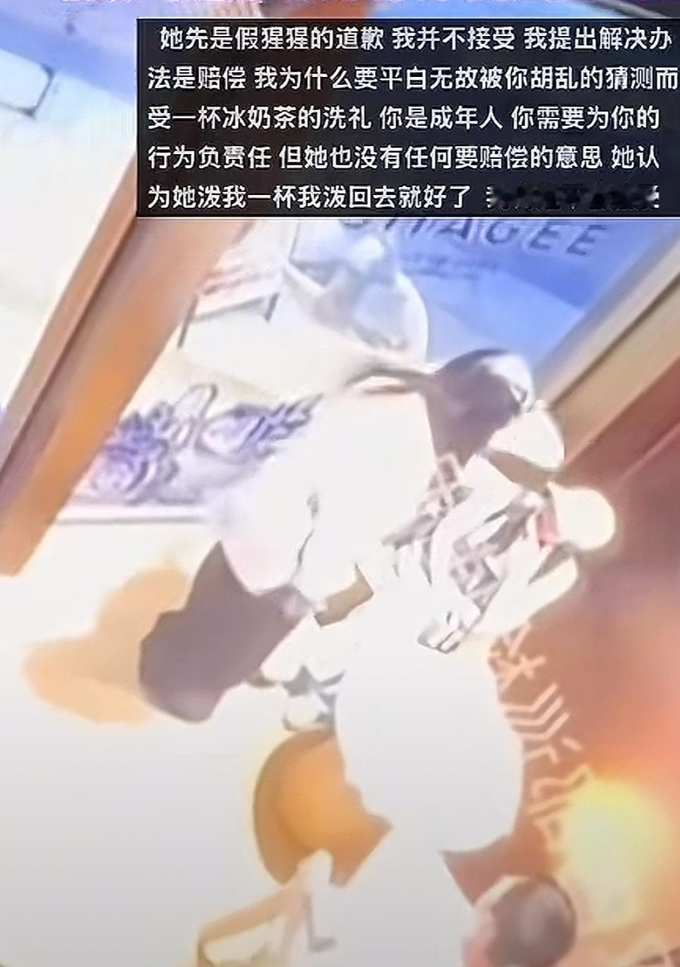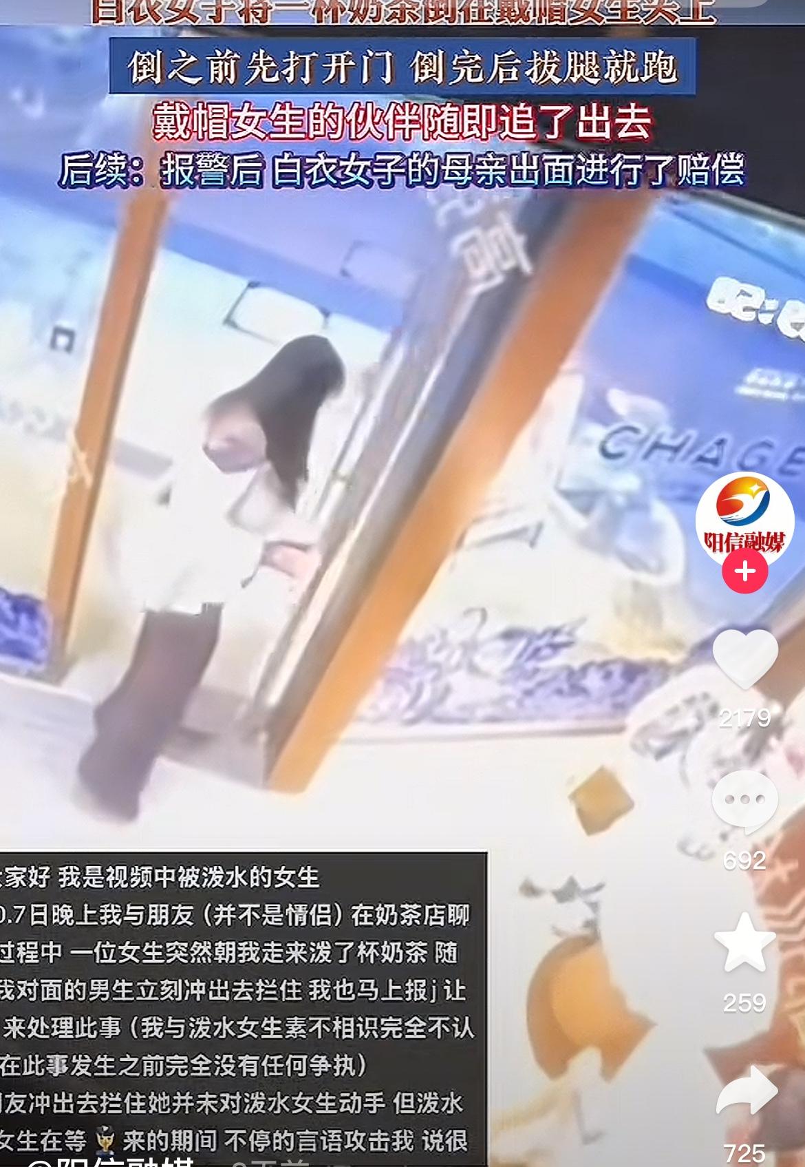 留学日本归来小仙女突然奶茶泼陌生女子,拔腿就跑,真相只是他们目光对视。小仙女认为女子和朋友的聊天在区区她,像是指桑骂槐,由此怀恨在心。小仙女逃跑的时候,还刻意打开奶茶店的大门,结果被女子的男朋友抓住了。小仙女满不在乎,说大不了让女子泼回去就好了。后来小仙女的母亲来了,不断向女子的道歉,并赔偿,才平息了风波。同样是南京,地铁鸡鸣寺的风波还没有散去。现在的小仙女太高看自己了,以为全世界的人都在关注她一样,对陌生人的一举一动都非常敏感,已经到了病态的程度,这是病。奶茶风波 奶茶异物事件 奶茶小美女