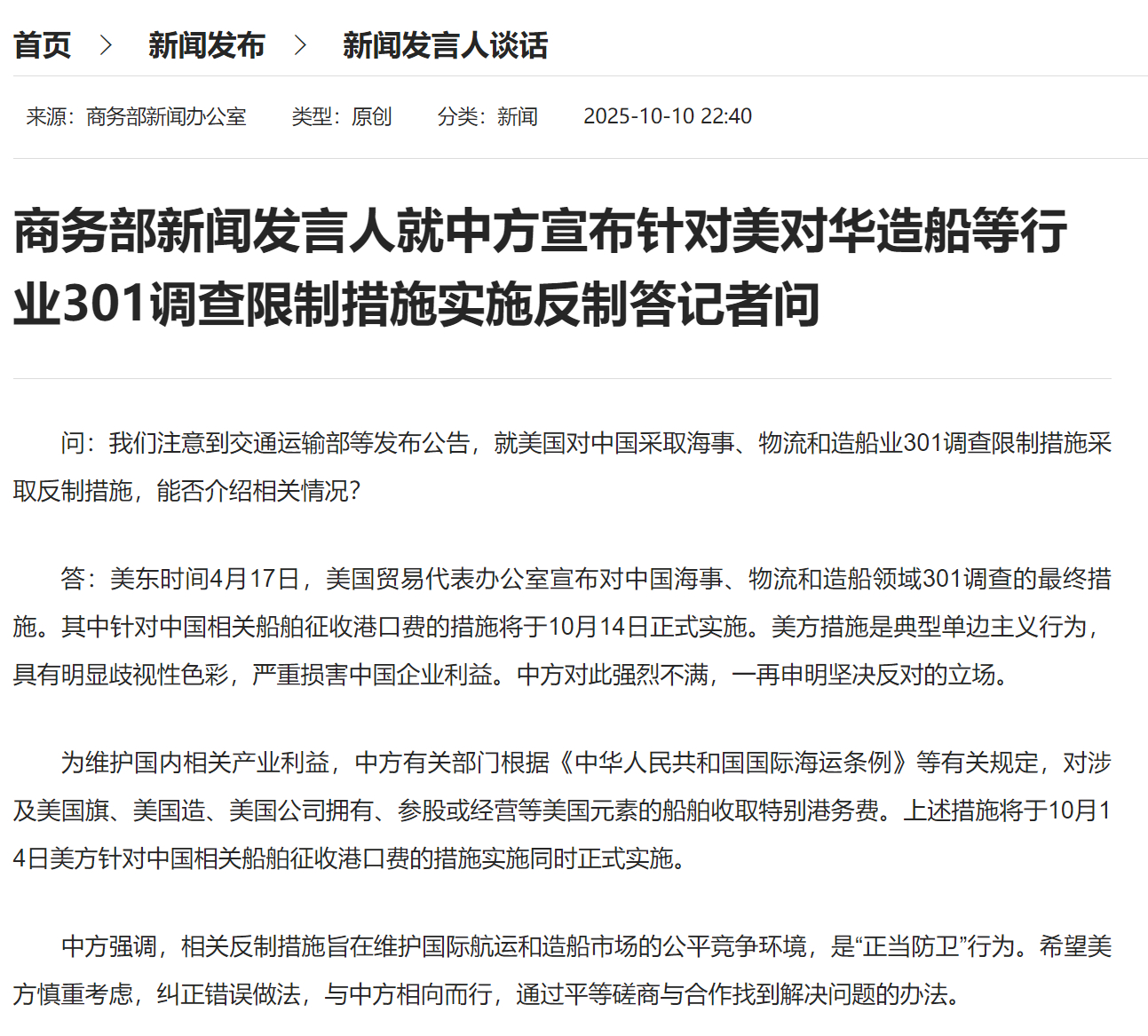 #商务部回应对美国船舶收取特别港务费#【商务部新闻发言人就中方宣布针对美对华造船等行业301调查限制措施实施反制答记者问】问:我们注意到交通运输部等发布公告,就美国对中国采取海事、物流和造船业301调查限制措施采取反制措施,能否介绍相关情况?#中方反制措施是正当防卫#