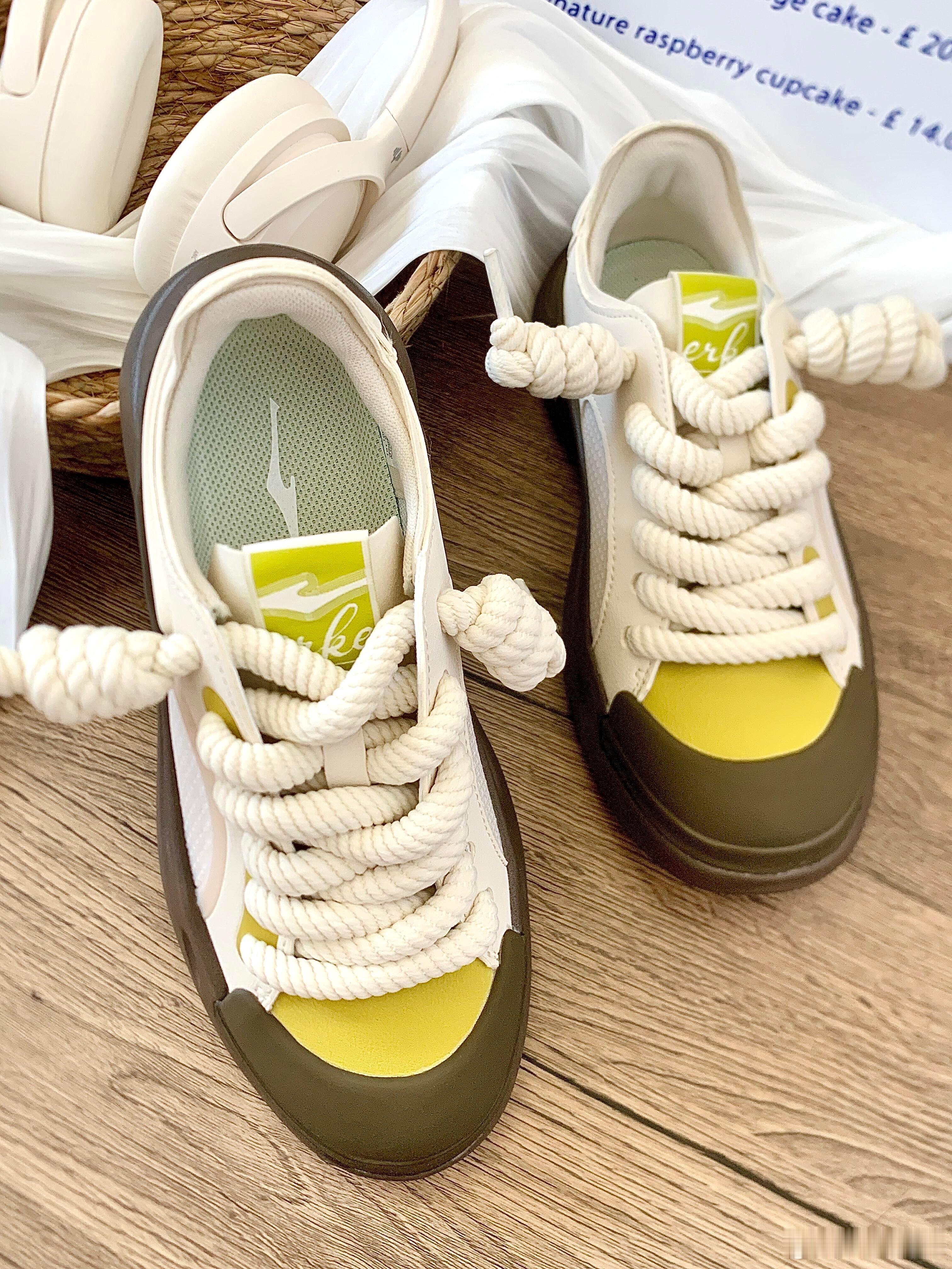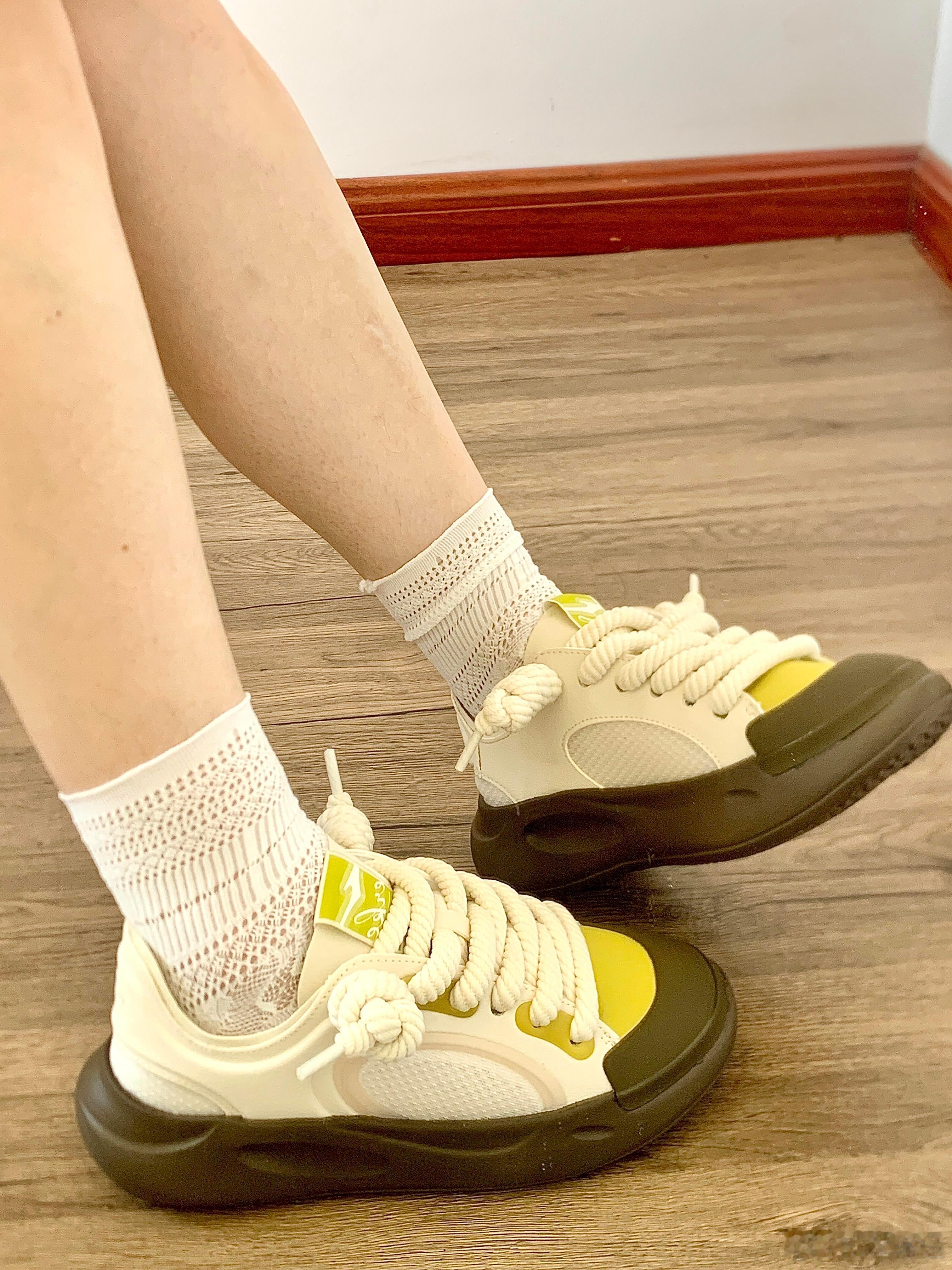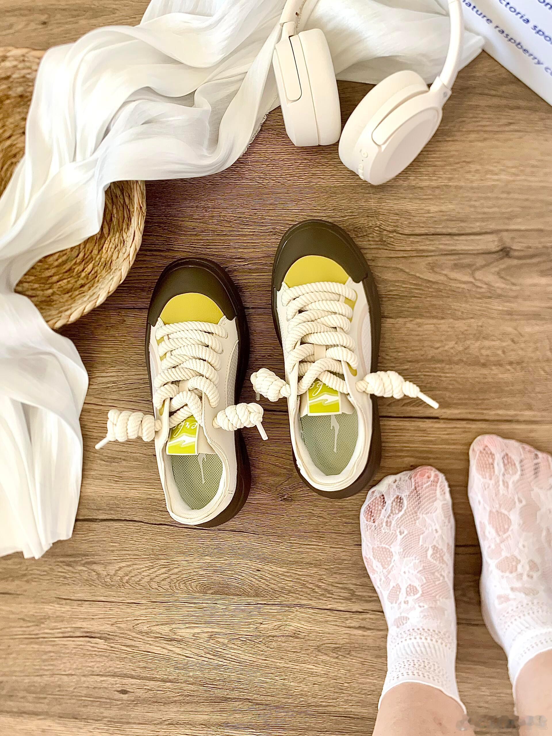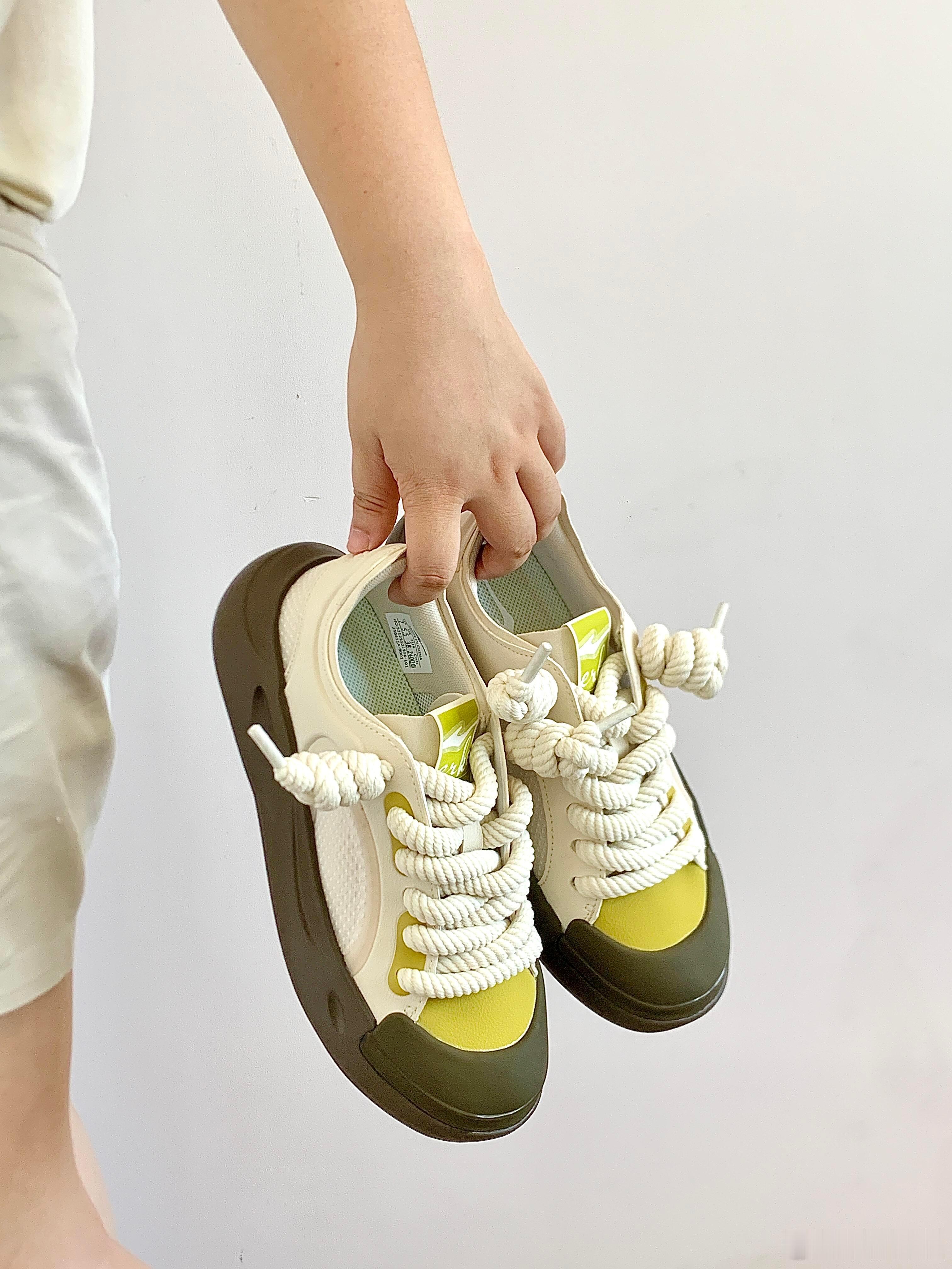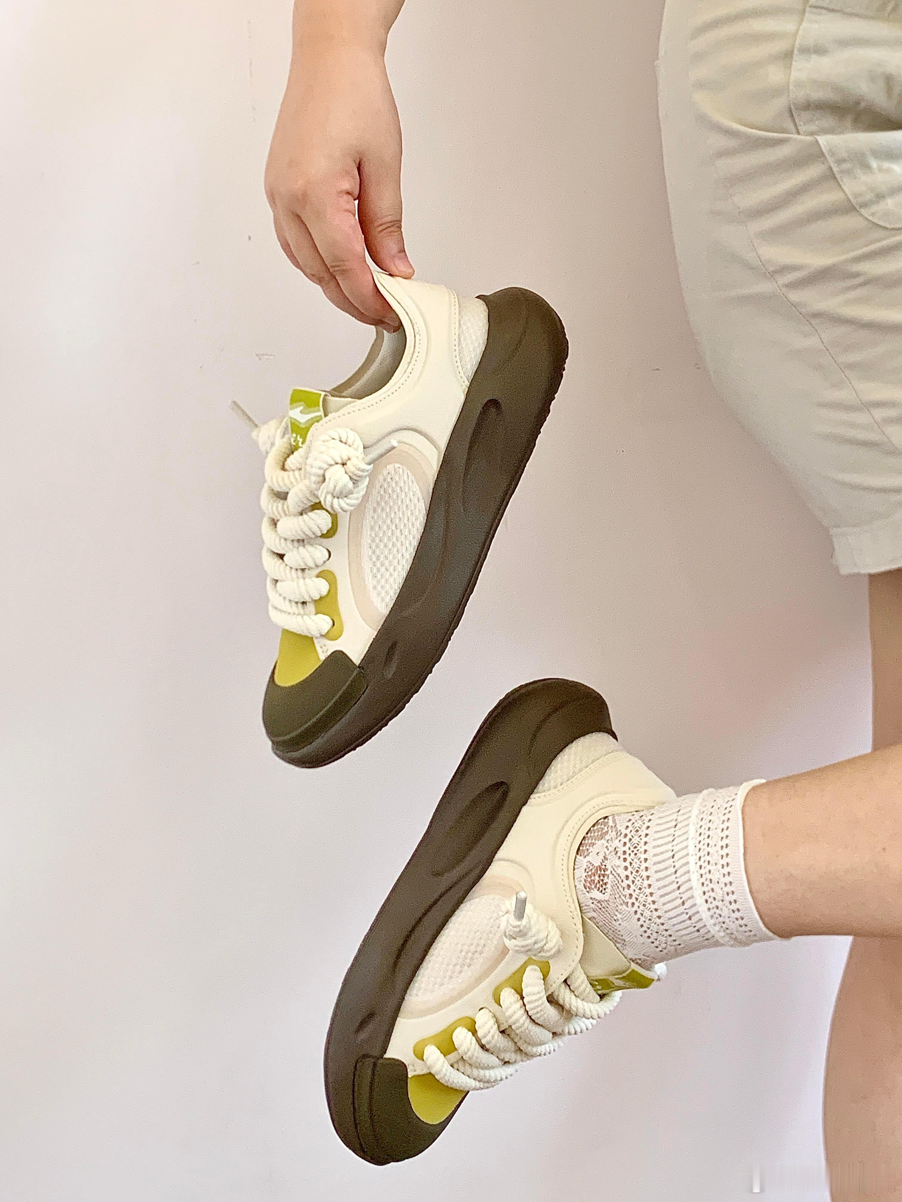 这双运动鞋以极具辨识度的廓形成为视觉焦点,其标志性的超厚底采用圆润的不规则设计,前掌为橄榄绿,后跟过渡为深灰色,在提供舒适脚感的同时彰显前卫个性。鞋身主体采用纯净的白色与奶油色皮革拼接打造,质感高级;而鞋舌标签与鞋头处的亮黄色细节则成为点睛之笔,瞬间点亮整体造型。特别值得一提的是,其粗棉绳鞋带系成的独特绳结,与随性搭放的白色薄纱相呼应,为设计注入了一丝手工感与轻盈气息。整体风格完美融合了复古厚底潮流与现代简约美学,既时尚又充满休闲活力,非常适合追求个性表达的日常穿搭。时尚鞋履SOTD鞋控的日常