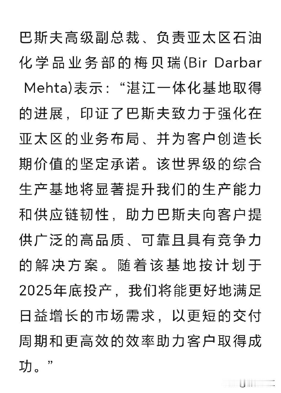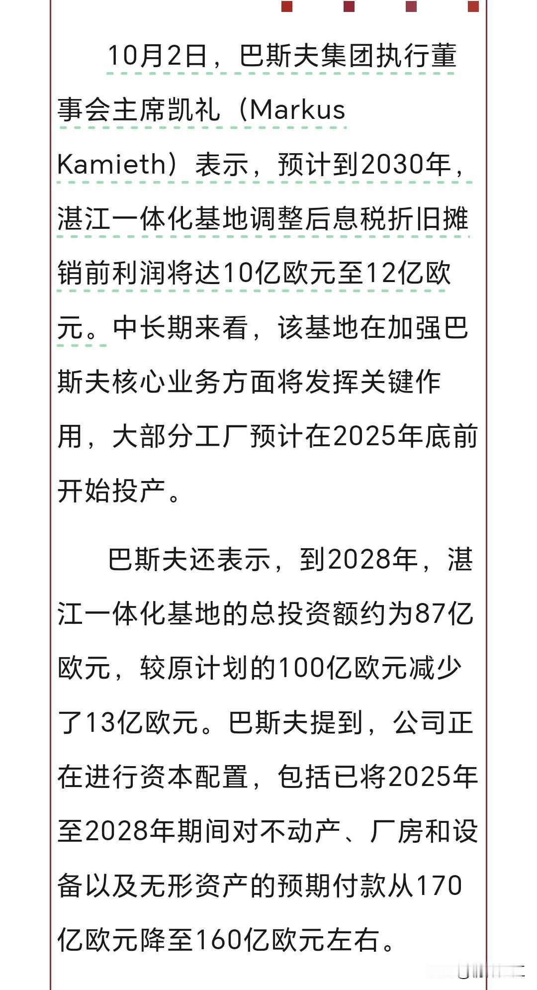 项目建设的进展顺利,巴斯夫湛江一体化基地今年底有望实现全面投产!预计2030年巴斯夫湛江一体化基地有望实现利润10—12亿欧元。但是,原计划总投资100亿欧元却缩小到87亿元。巴斯夫集团对湛江项目的进展非常满意,点赞湛江营商环境。