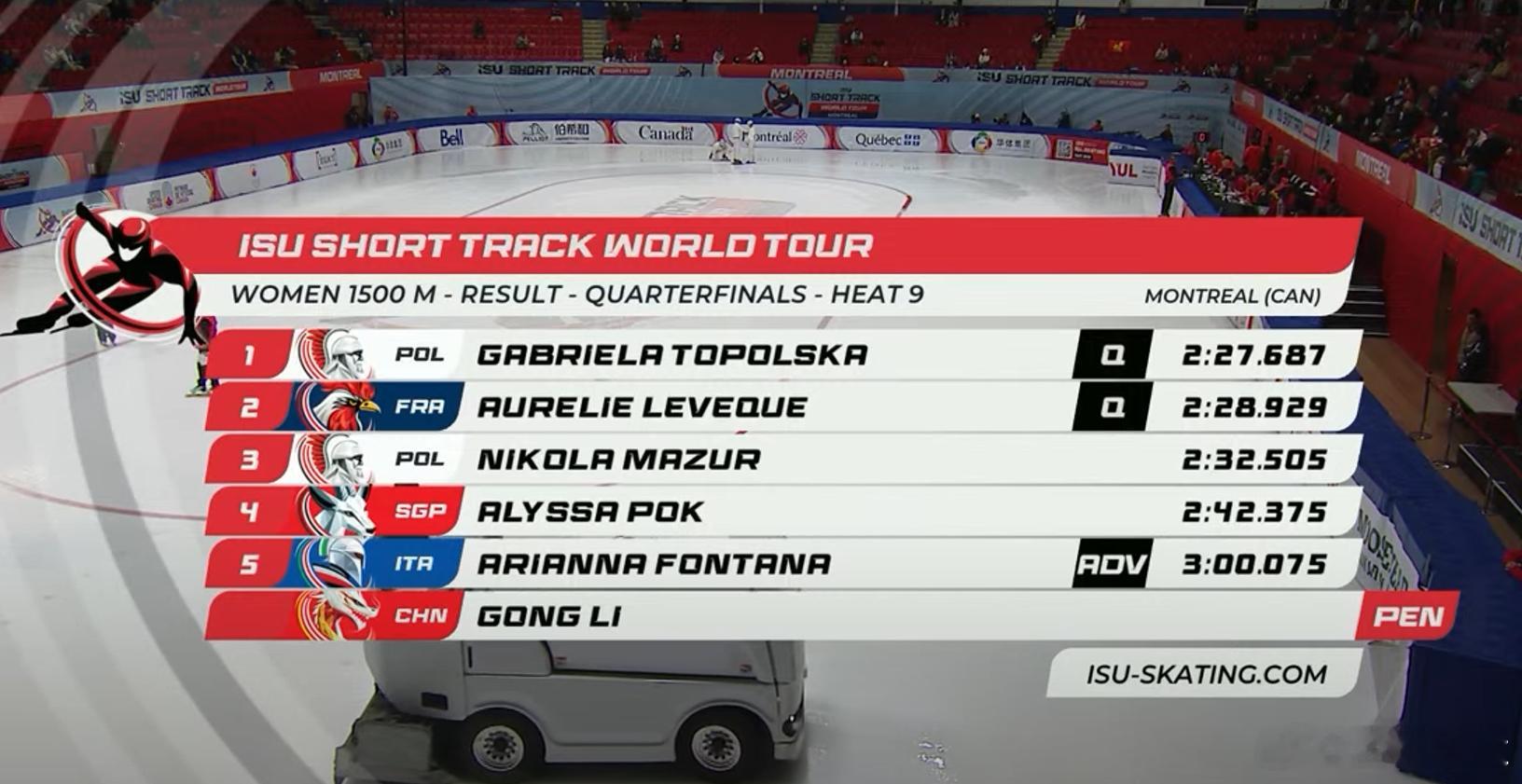 但随后公俐被判直道末端区域内的领先选手未按规定让行,被判犯规无缘下一轮。短道速滑世界巡回赛短道速滑中国短道速滑队
