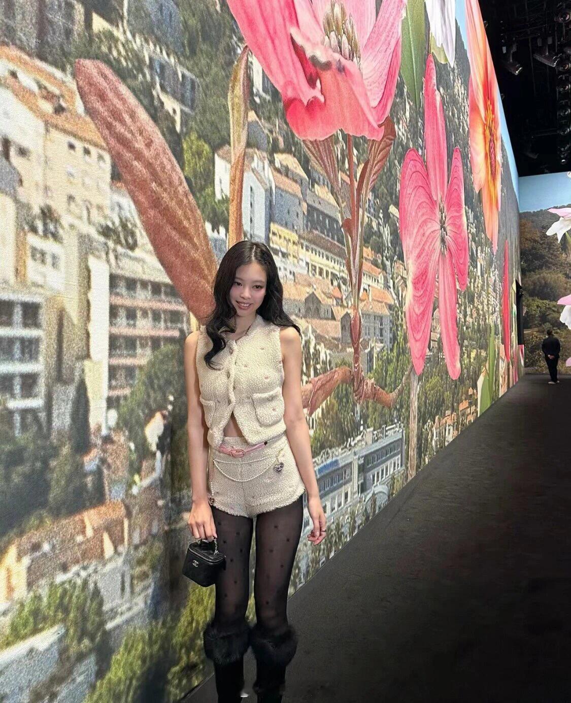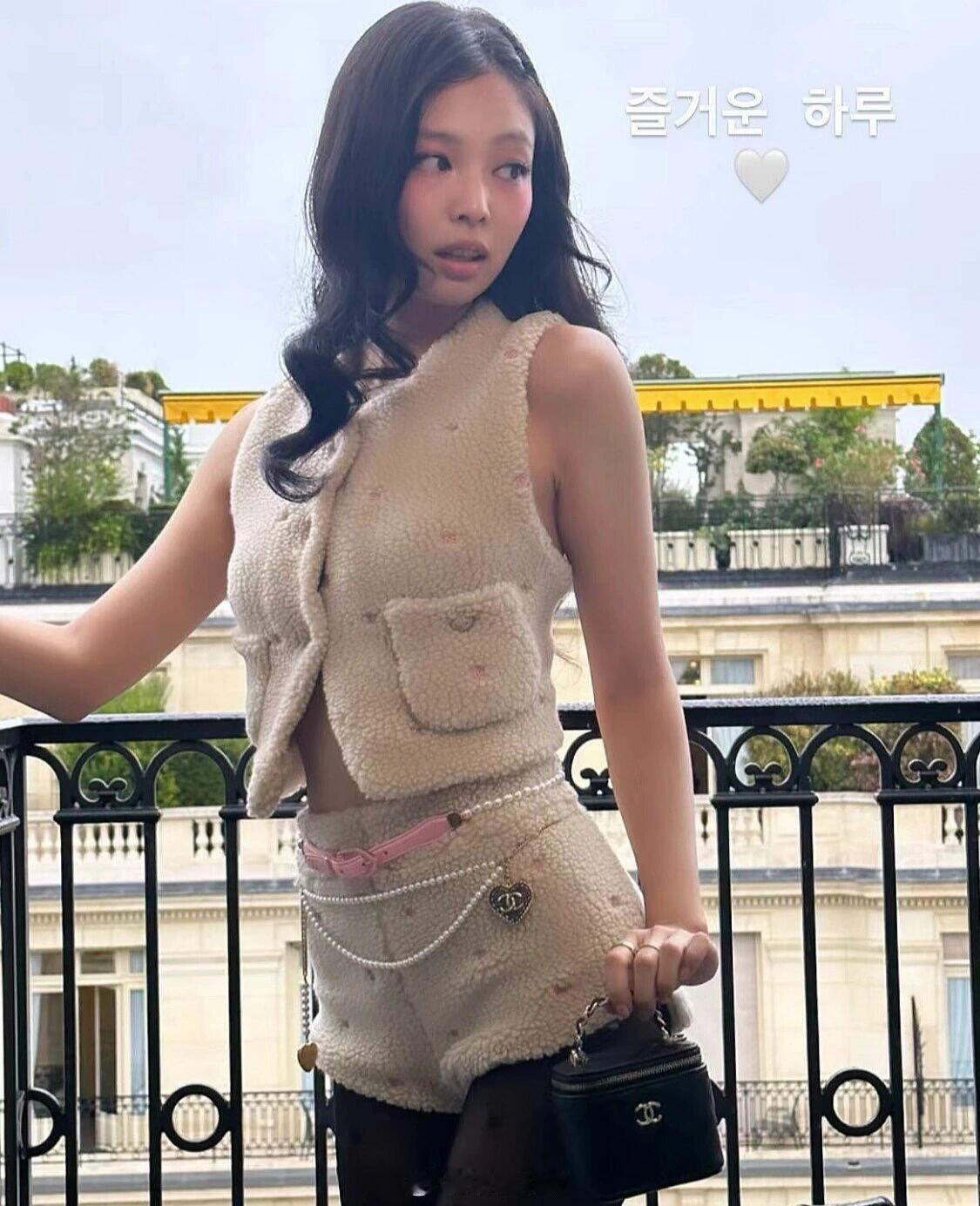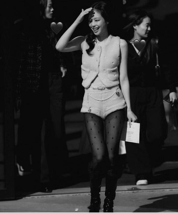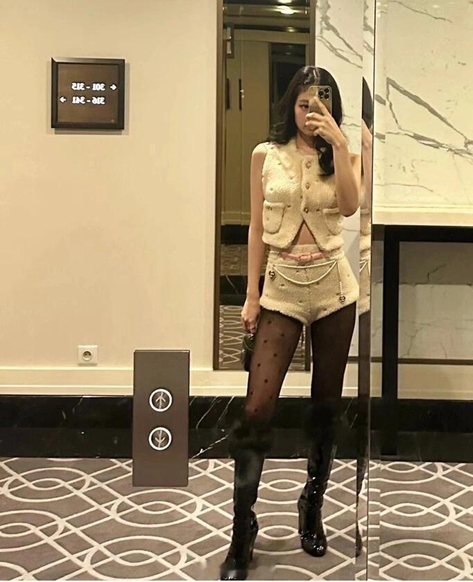 羊羔毛套装配黑袜高靴,珍珠腰链点缀还挺别致妮妮真的很喜欢穿丝袜,美美哒~
