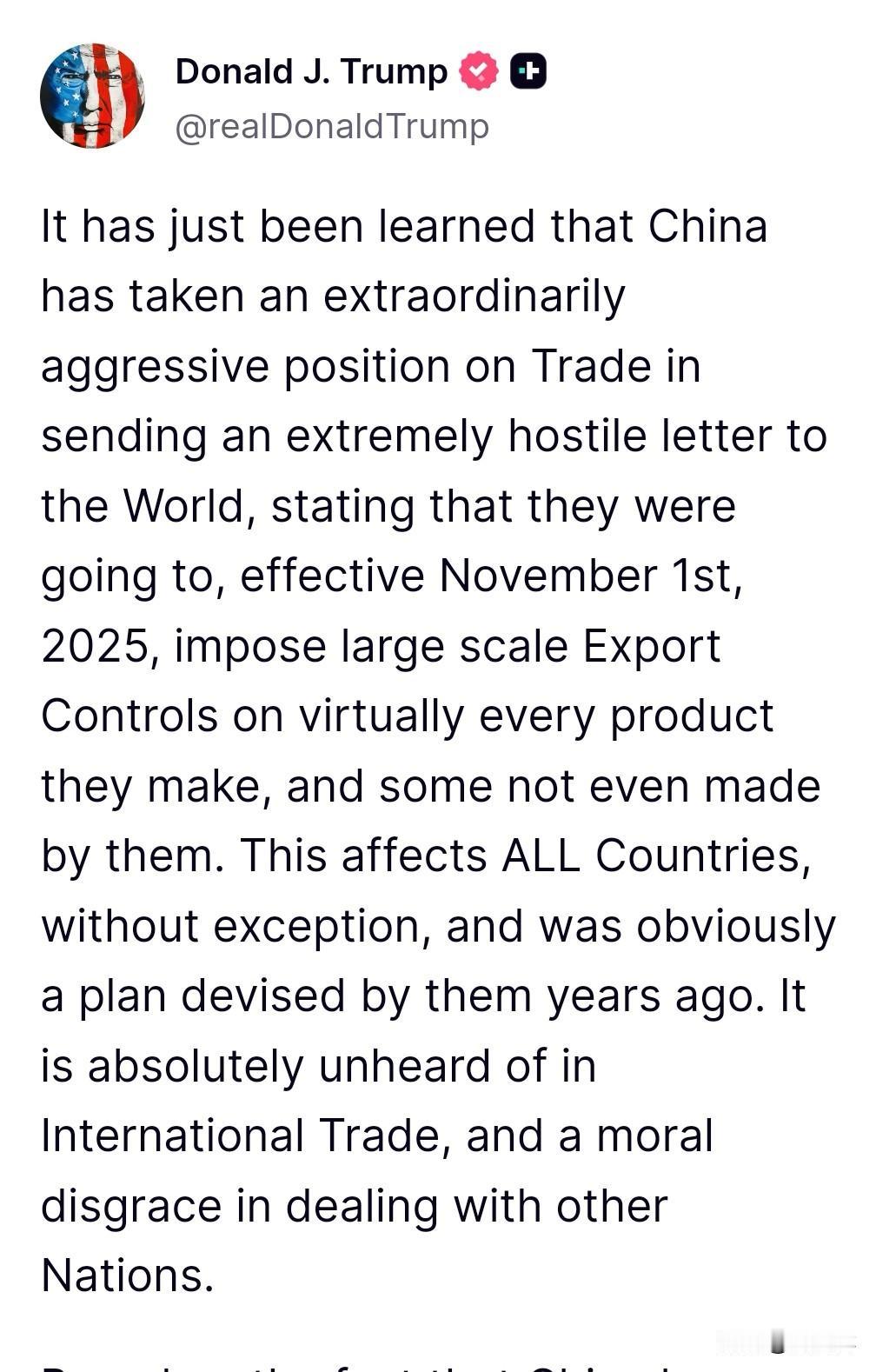 10月11日,特朗普宣布对中国加征100%的关税。其在“真实社交”发文如下: 我们刚获悉,中国在贸易问题上采取了极其咄咄逼人的立场,向全世界发出了一封充满敌意的信函,声称他们将于2025年11月1日起,对其生产的几乎所有产品,甚至一些并非他们制造的产品,实施大规模的出口管制。此举影响所有国家,无一例外,显然是他们多年前就策划好的阴谋。这在国际贸易史上闻所未闻,是在与其他国家交往中的一种道德耻辱。 鉴于中国采取了这一前所未有的立场,我谨代表美利坚合众国(而非其他同样受到威胁的国家)宣布,自2025年11月1日起(或根据中国的进一步行动或变化而提前),美国将对中国的所有商品征收100%的关税,此关税是在其现有缴纳关税的基础上额外加征。同样在11月1日,我们将对任何及所有关键软件实施出口管制。 令人难以置信的是,中国竟然会采取这样的行动,但他们确实这么做了,其余的已成历史。感谢各位对此事的关注!