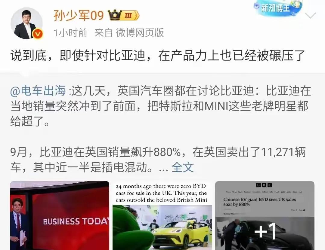 太炸裂了 比亚迪在英国销量暴涨880%,9月在英国卖出了11271辆。 其实最重