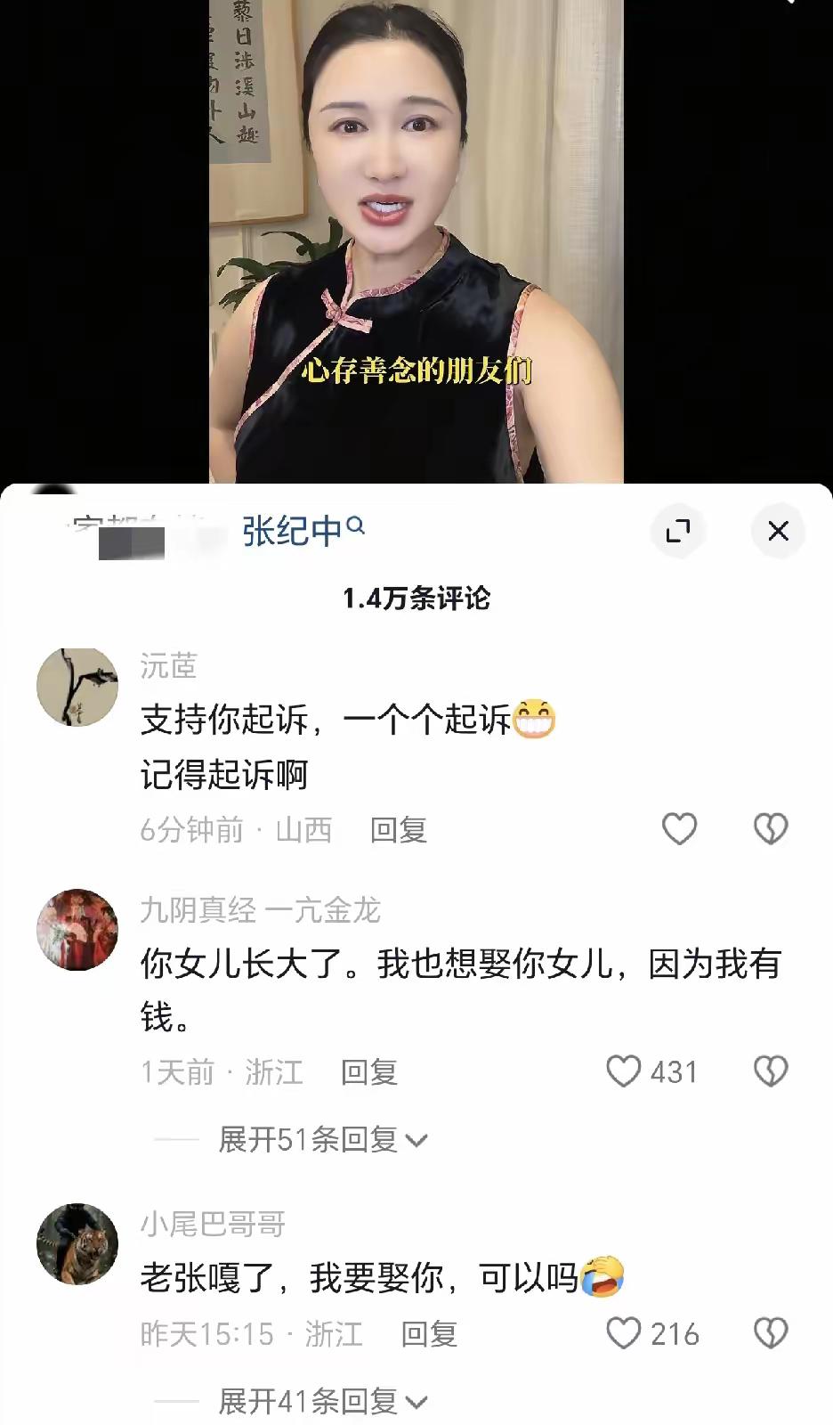 张纪中妻子杜星霖最近因为网友的评论真急了。原来张导晒了一岁女儿的生日照,结果评论区好多四五十岁的人说要娶她女儿。杜星霖气得发视频哭诉,说已经取证,非要把这些口无遮拦的网友告上法庭不可。 其实互联网就这样,你想拍照或拍视频都可以,自己收藏暗暗欣赏什么事都没有。一般来说聪明的名人,都把自己的亲人隐藏的很深,甚至从来不一起出现在公众视野里,既然晒出来就是为了博眼球,就得面对有些人用不一样眼光和思维,想让任何人都喜欢自己根本不可能,所以能接受赞美也要接受诋毁。 当然有些网友也太可怕了,在网上口嗨不犯法,所以什么语言都往外说,张纪中和他的妻子年龄有差距,这个是他妻子心甘情愿的,张纪中又没有强迫。网上的老男人用污言秽语说一个小宝宝,实在是太过分了。