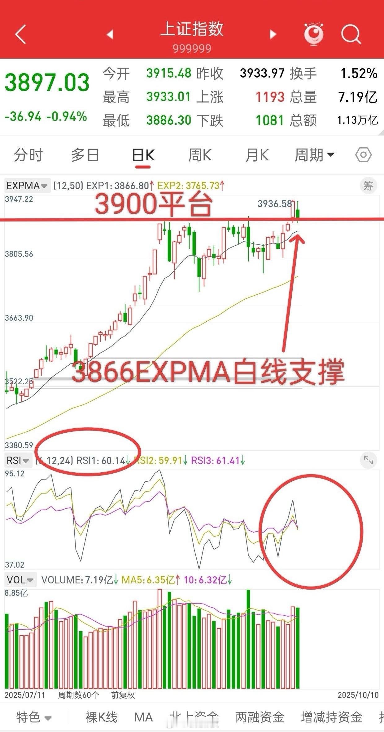 A股呢,昨天突破3900加速拉升,今天回踩支撑,破了,那又如何呢?你只要不再突破3900加速拉升时,追高,今天下跌无非就是利润回吐,有什么好担心的呢,下方支撑3866附近,Rsi指标60,多头趋势良好。
