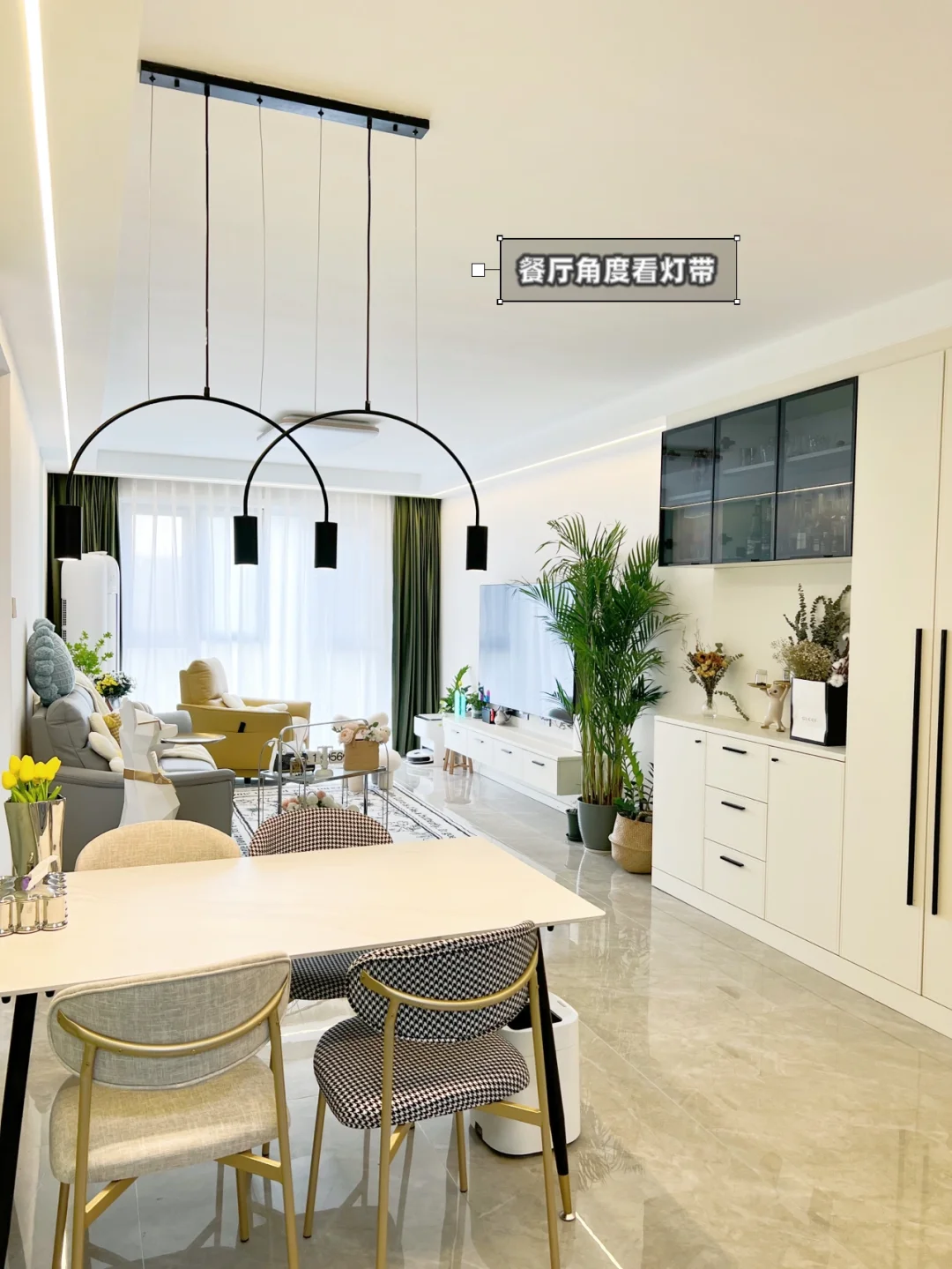 4⃣️亮度:我家灯带装了一整圈,晚上客餐厅只开灯带一点也不暗,效果如图4,非常有氛围感,如果不是有特殊需要我晚上基本只开灯带的。