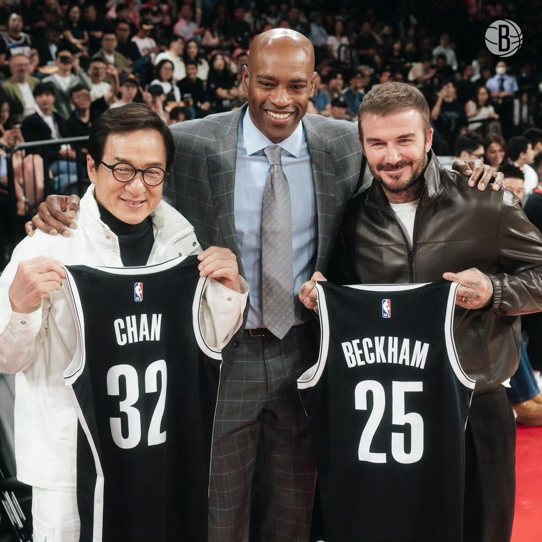 马云成龙贝克汉姆并排观赛成龙获赠篮网32号球衣nba中国赛2025