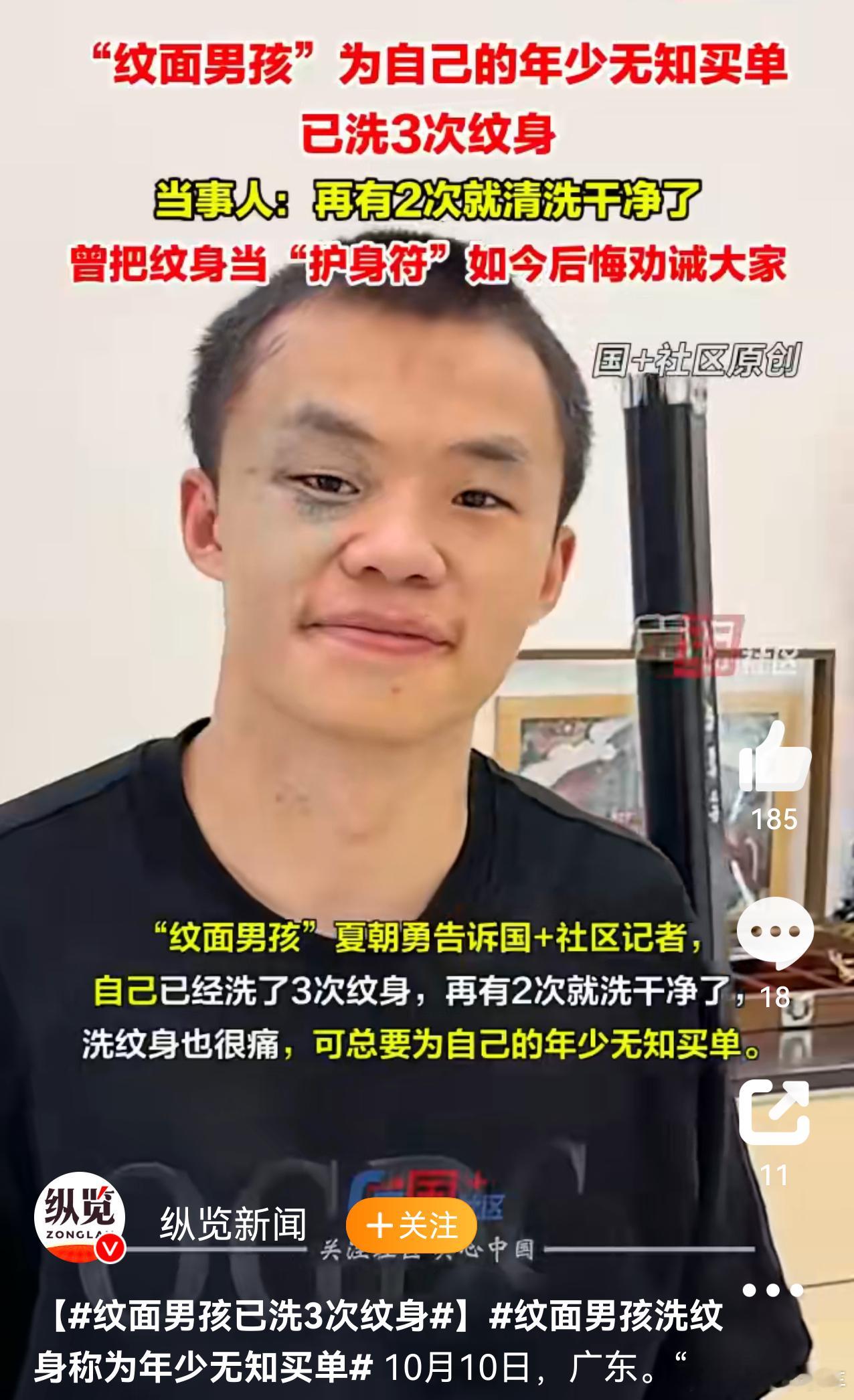 纹面男孩称再洗2次纹身就干净了终于能看到真实面容了,有多少是纹完之后就后悔了的,