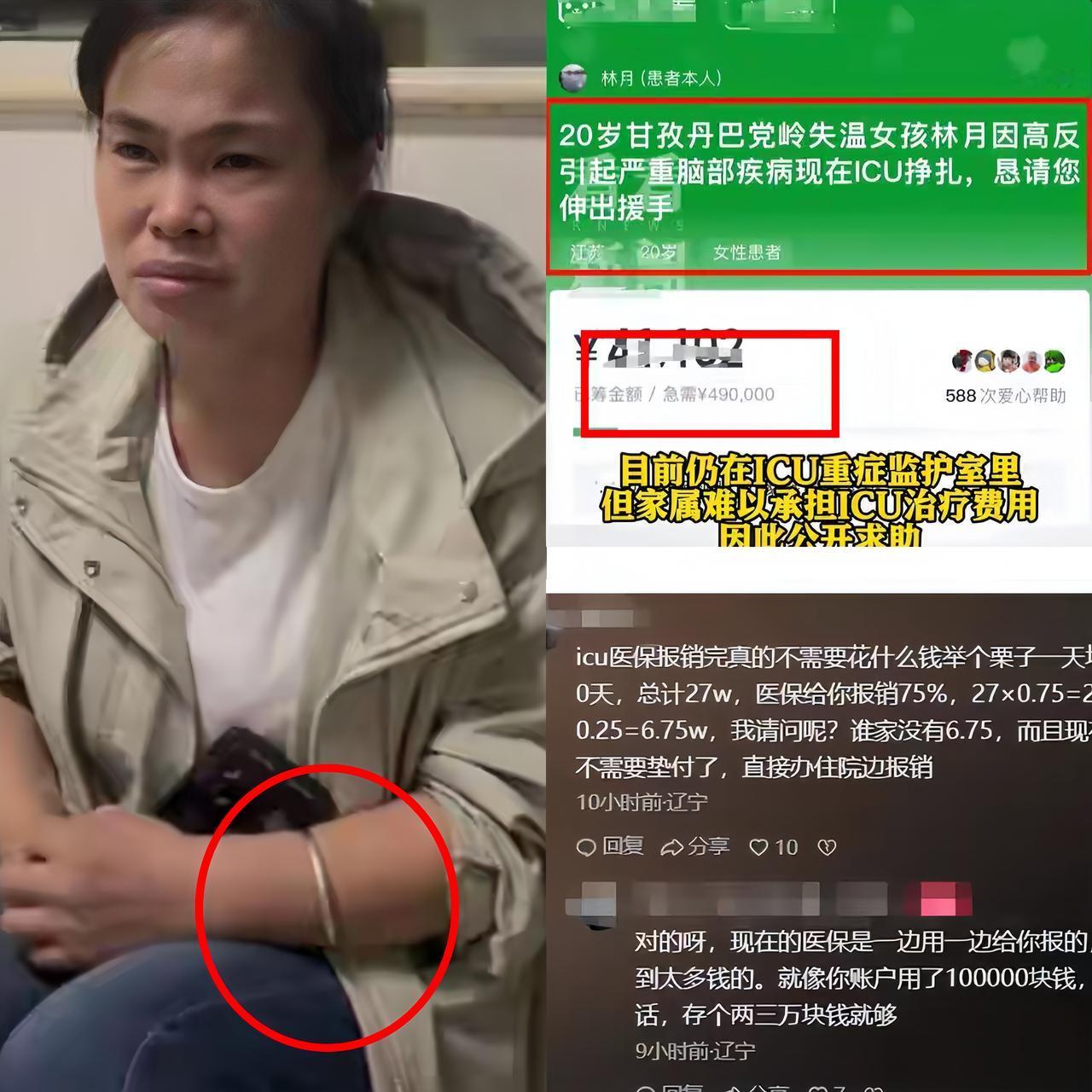 女孩党岭徒步高反进ICU,父母众筹49万引争议! 这年头,出去玩出事就找网友筹钱,享受的时候怎么没想到我们?” 面对高昂医疗费,女孩父母在网上发起49万元众筹! 有网友发现,在接受采访时,女孩母亲手腕上明显戴着一个金镯子。 “有钱出去玩,没钱治病?”这条评论获得高赞。 更有人算了一笔账:“ICU医保报销比例不低,为什么要全额众筹?这分明是一分钱不想自己出。” 并有网友给计算出来她家花费! icu一天均3000,住90天,总计27万,报销比例是75%,相当于报销了20.25万,自己只花了6.75万,现在医保是直接结算,根本不需要自己垫付! 更有网友说:按现在的金价计算,她母亲手上的金镯子就差不多够医疗费用了! 以前就有一对夫妻自驾游西藏出现高反后上网筹钱,被网友发现他们开的是豪华越野车。类似事件一次次消耗着公众的爱心。 关于医疗费用,需要澄清一个误解。 虽然医保可以报销部分费用,但ICU中有许多药品和项目不在报销范围内。异地就医的报销比例也可能降低。 不过,众筹49万确实让人产生疑问,为什么要全额筹款?难道家里一分钱都拿不出来吗? 目前众筹金额已达8万多元。女孩的生命安危牵动人心,而这场围绕众筹的争议也是值得我们思考的! 大家怎么看这事!欢迎评论区聊聊