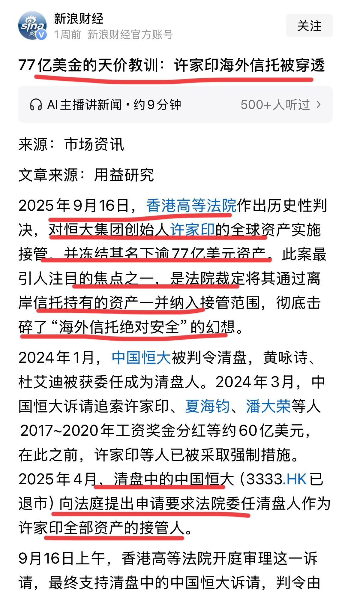 中国新闻周刊报道:许家印的家族信托“防火墙”被彻底击穿了!2025年9月16日,
