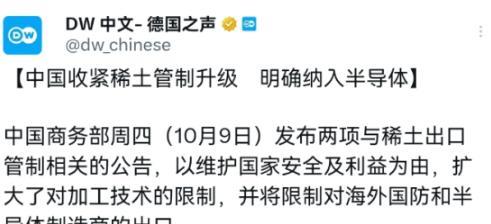 出手力度非常大!外媒意识到事态严重了!在我们宣告对稀土技术进行管制之后,德媒感到事态非常的严重!10月9日,德国之声刊文表示,中国这一次稀土技术管制力度非常的大。而这其中两个方面,将会给美国等国家构成非常大的麻烦。 10月9日,商务部一口气甩出第61号和第62号两份公告,直接把稀土管制的力度拉满,这波操作直接戳中了美国等国的两大死穴。 先说说第一个麻烦,这技术壁垒简直是焊死了的铁门,想绕都绕不开。稀土真正值钱的其实是背后的加工技术,中国早就把这条产业链玩得明明白白。全球稀土矿储量其实不少,美国地质调查局早年的数据显示全球有1.2亿吨,美国自己就有1300万吨,可储量再多也没用,就像守着金山却不会炼金。 中国光加工产能就占了全球 81%,更别说近十年的稀土专利数量早就超过其他国家的总和。这次管制直接把稀土开采、冶炼分离到磁材制造的全流程技术都圈进了管制清单,连生产线的调试维护技术都不让往外流,等于直接断了别人抄作业的可能。 更狠的是这次连边角料都算上了,公告里明确只要境外产品里中国稀土成分占比达到 0.1% 以上,出口就得拿中国的许可证。 别小看这 0.1%,稀土这东西本来就是“点石成金”的材料,导弹制导系统里的永磁材料差一点纯度都不行,性能能差出 100 多倍。以前他们还能买些粗加工产品自己再提纯,现在连带中国成分的半成品都受管制,等于被掐住了脖子。 更要命的是,新规连中国技术人员给境外提供帮助都禁止了,等于断了他们的技术外援,想建厂都没人会搭架子。 第二个麻烦更直接,直接戳中了美国等国的军事和高端制造命脉。稀土这东西早就是现代武器的“维生素”,之前美国国会有份报告算过账,造一架战斗机得用 920 磅稀土,一艘驱逐舰要 5200 磅,核潜艇更是要用到 9200 磅,小到导弹的方向舵驱动电机,大到航天器的磁轴承,没稀土根本玩不转。 现在新规明确说了,给军事用途的出口申请原则上就不批,这等于直接断了美军的补给线。以前他们还能通过第三国转一手蒙混过关,现在只要用了中国的稀土或者中国的技术,不管转几手都得要许可,想造假都难,国家安全部之前就警告过,有境外承包商靠伪造标签偷运,现在这招彻底失灵了。 高端制造领域同样遭重,新规里特别提了,用于14纳米以下逻辑芯片、256层以上存储芯片的稀土物项要逐案审批。现在全球顶尖芯片制造哪离得开稀土靶材?美国本来想在半导体领域卡别人脖子,结果反过来被稀土绊了一跤。连美国自己的磁铁公司老板都急了,说以后可能连设备都拿不到,就算拿到设备,调试维护的技术支持也没了,这生产线等于成了摆设。 德国媒体之所以慌得不行,因为德国汽车业早就押宝新能源,而电动车的驱动电机全靠稀土永磁材料,宝马、奔驰的电动车型要是没了稳定的稀土供应,转型计划就得打水漂。韩国工业部门已经急着评估影响了,德国这些汽车巨头自然更坐不住,毕竟他们的新能源转型可等不起产业链重建的时间。 从2006年开始中国就逐步收紧稀土管控,现在算是把技术这张王牌亮了出来。美国等国以前仗着能买到便宜的加工品,自己干脆不搞研发生产,把生态成本都丢给别人,现在想回头重建产业链,才发现根本不是花钱就能解决的事。 德媒看明白的其实不只是管制力度大,而是这招直接点中了全球产业链的死穴,核心技术和完整产业链都攥在中国手里,想摆脱依赖?没个十年八年根本没戏,这才是最让他们坐立难安的地方。