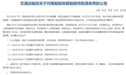 中方明码标价,3天后,美国船只就得乖乖交钱 中国交通运输部宣布,对美国船舶收取船舶特别港务费用,以反制特朗普政府一系列针对中国的错误举措。 这事儿得从今年4月说起,当时美国贸易代表办公室突然宣布,要对中国海事、物流和造船领域搞 301 调查的最终措施,直白点说就是要给停靠美国港口的中国船舶收高额港口费,还把生效日期定在了 10月14日。 这明摆着是想靠这种歧视性手段打压中国的造船和航运业,毕竟这些年中国造船业的势头太猛,2025 年前8个月以吨位算占了全球53%的订单份额,几乎和2023年全年持平,美国看着眼馋又追不上。 面对这种蛮不讲理的操作,中方自然不能坐视不管,交通运输部直接亮出反制方案,明确说了美国船舶的特别港务费也从10月14日开始收,正好和美方的措施撞在同一天,这波对等反制简直是教科书级别的回应。 具体怎么收都标得清清楚楚,今年10月14日起按每净吨400元算,到2026年4月就涨到640元,2027年4月再提至880元,2028年4 月直接升到1120元,而且规矩也讲得明白,同一航次挂靠多个中国港口只在第一个港口交钱,同一艘船一年最多收5个航次的费。 美国可能以为自己握着主动权,其实早就把自己架在了火上烤。要知道中国港口的实力摆在那,全球货运吞吐量前十的港口里中国占了八席,集装箱吞吐量前十里占了六席,自动化码头的建成和在建数量都是世界第一,美国船只想做中国生意,根本绕不开这些港口。 就拿美国的农产品和能源出口来说,多少大豆、液化天然气要靠船运到中国,以前是空船过来装货,现在只要沾了美国元素,不管是美国公司拥有的、挂美国旗的还是美国造的船,都得乖乖交钱。 美国国内的进口商和农业、能源行业已经吵翻了天,他们比谁都清楚,这笔费用最后还是得转嫁到自己头上,要么企业利润缩水,要么消费者买单,世界航运理事会都预估了,美国消费者每年可能要多掏300亿美元的冤枉钱。 更有意思的是,美国想靠这招逼航运公司远离中国船厂,结果根本没人买账。全球最大的集装箱船运营商地中海航运,明知美国要收港费,照样在中国订了12 艘新船,因为大家都明白,中国船厂的产业链完整、造舰技术靠谱,价格和效率更是没对手。 反观美国自己,商船总数不足100 艘,造船产能连全球 1% 都不到,劳动力缺、设备老、技术落后,就算想重建造船业,没个十年八年根本起不来,还得砸巨额补贴,这在美国的政治体制下简直难如登天。特朗普政府想搞垄断,说白了就是打错了算盘,自己的海运产业根基早虚了,还想抢别人的饭碗。 现在距离 10 月 14 日就剩3天,美国船只根本没有退路。要么交钱进港做买卖,要么硬着头皮放弃中国市场,可中国作为全球重要的贸易伙伴,谁舍得真的离开?之前美国搞关税战,中国航空公司直接暂停接收波音飞机,就让美国航空业尝到了苦头,这次航运业要是受了冲击,美国的损失只会更大。 而且中方的措施有法可依,不管是《中华人民共和国国际海运条例》还是国际法的对等原则,都站得住脚,完全是维护自身权益的正当防卫。 说到底,这事儿从头到尾都是美国单边主义惹出来的麻烦,中方只是用最直接的方式告诉他,想搞歧视性打压可以,但得先掂量掂量自己能不能扛住后果。3天后,那些美国大船开到中国港口,除了交钱根本没有第二个选择,毕竟生意要做,规矩也得守,想占便宜又不想付出代价的好事,早就行不通了。