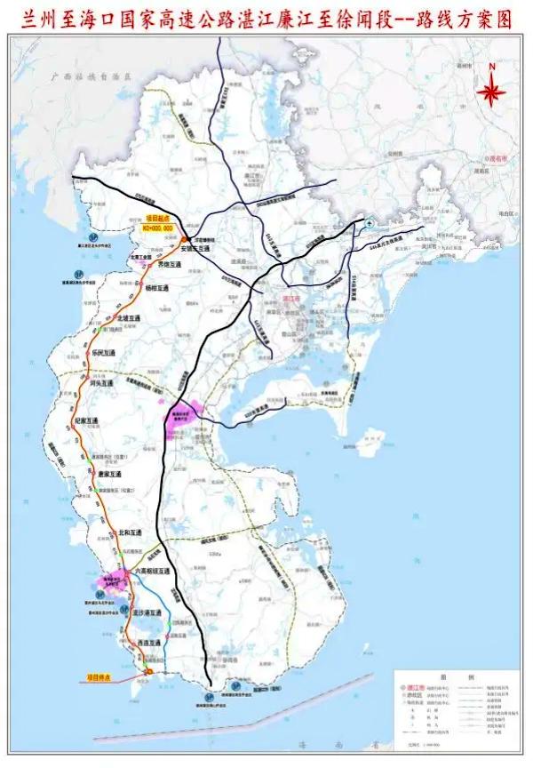【兰明至海口高速公路湛江廉江至徐闻段新建工程】正在开展招投标工作,即将正式开工。主线全长约153千米,估算投资约196亿元,采用双向四车道标准建设,设计时速120千米。路线起于廉江的横山镇,顺接汕湛高速兰海支线,途经遂溪县,雷州市西部沿海区域,止于湛江市徐闻县,顺接广东滨海旅游公路。设置桥梁约35000米,互通立交11处,服务区3处,停车区2处。互通连接线1条约5700米(迈陈)。项目的建设有利于完善区域交通基础设施网络,提升交通通行效率和服务水平,助力内陆与海南岛的互通交流,更好地满足人民群众交通通行需求,助推粤港澳大湾区、海南自贸港、北部湾城市群发展,促进区域经济社会高质量发展。