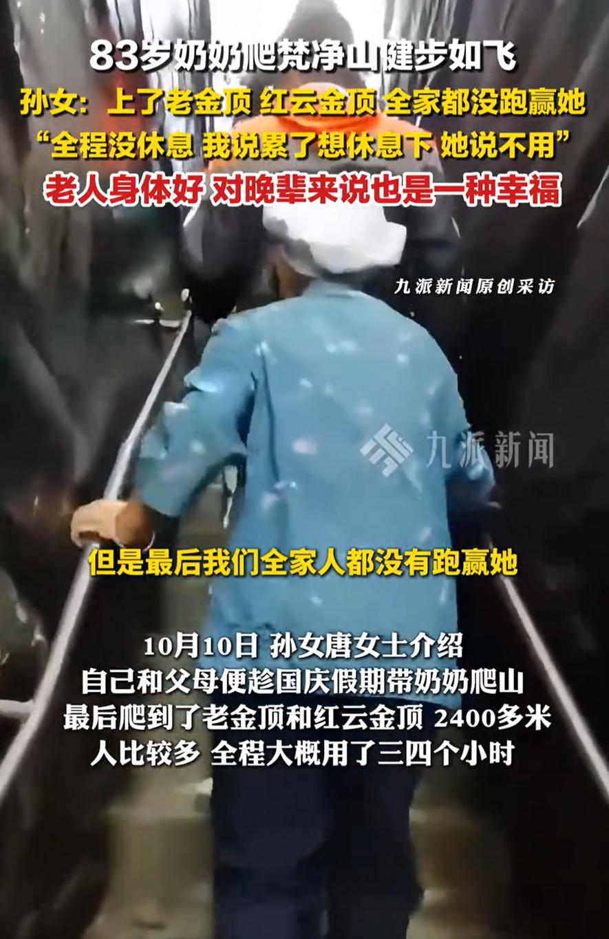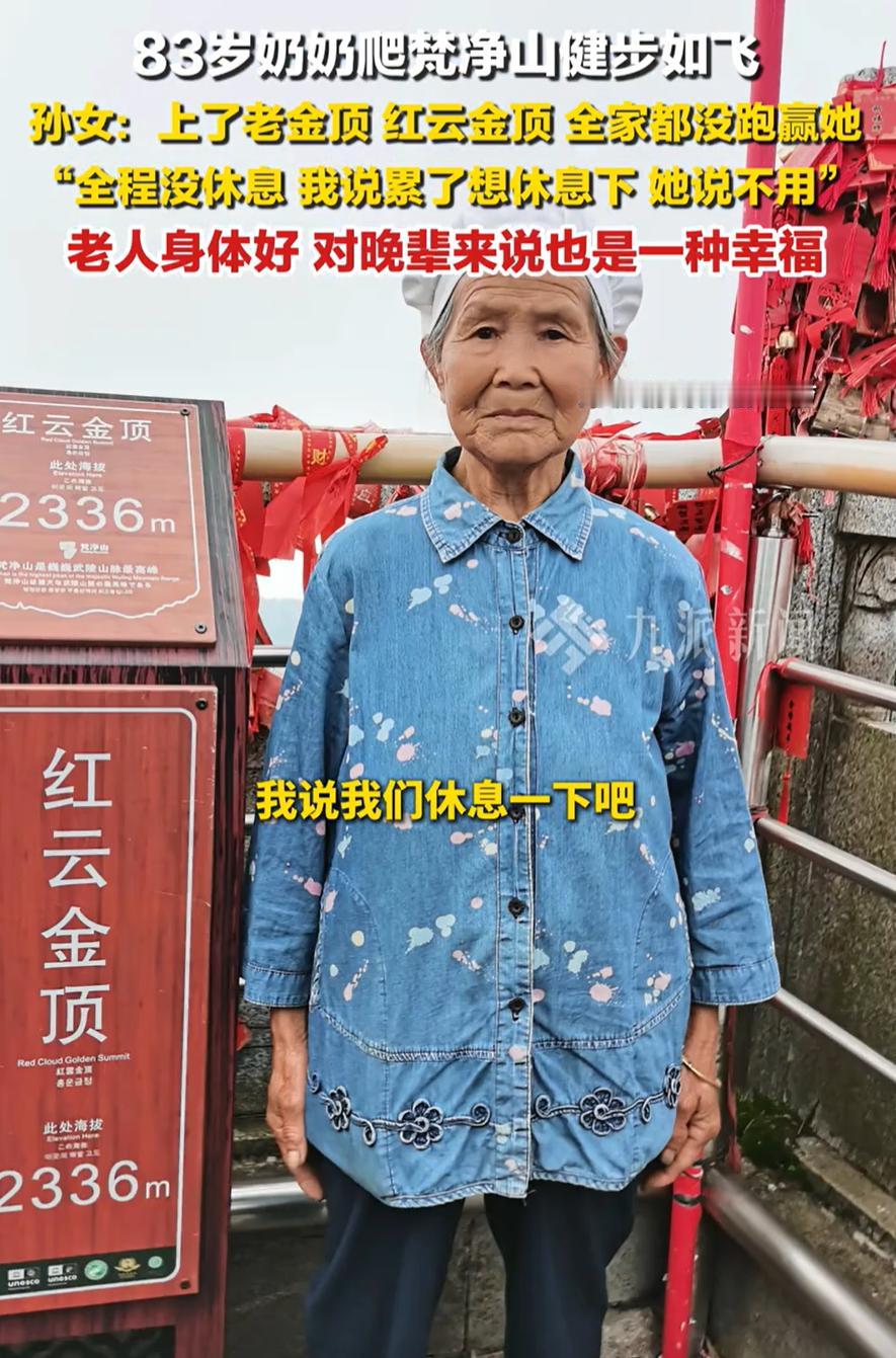 “这是真厉害!”贵州铜仁,中秋假期一家人商量去爬梵净山,家里83岁的奶奶听到后,说什么都要一起去,虽然家人都知道老人身体好,可没想到,真爬起山来,一家人都没跑赢她,全程没休息直接爬到了山顶。网友:这老人家比我牛多了 视频中,老人在爬山时虽然拿着拐杖,但全程都没有用到,背着一只手就是一路往上爬,知道的这是老人,不知道的还以为是运动健将,就连跟在身后拍照的孙女,都一直喊着让奶奶慢一点,自己跟不上了 孙女唐女士介绍,奶奶平时在家就闲不住,一直在干农活,身体非常硬朗,当时上山前还想着,奶奶要是爬不动了就不去了,结果最后爬到了老金顶和红云金顶,2400多米,全程大概用了三四个小时,一家人都被她落在了后面 其实,这事不光是老人家身体好,更是一种心态。很多人退休后就开始怕动,怕摔、怕累、怕生病,久而久之反倒真动不了了。奶奶这一辈人,身体是靠干活练出来的,心态也是在一点点坚持中磨出来的。她不光是在爬山,更是在告诉后辈:活着就得动,越动越有劲 生命的活力从来不只是数字的累积。83岁,在很多人看来是该颐养天年的年纪,但这位奶奶用行动告诉我们,年龄只是记录时间的方式,不代表生命的宽度 所以,83岁爬上山顶并不是奇迹,而是她几十年如一日的生活方式在作数。她证明了一个朴素的道理:身子硬朗的秘诀,不在保健品,也不在养生课,而在每天都不让自己闲着
