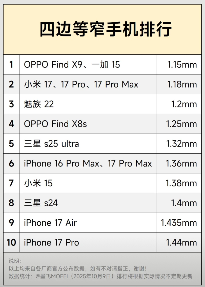 四边等窄手机排行新增OPPO Find X9,与一加15一样都是1.15mm,并列第一,小米17系列第二,魅族22第三... vivo X300什么时候公布?会不会超越当前第一名?