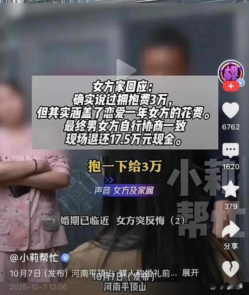 10月7日,河南平顶山,男子婚礼前遭女方退婚,按照习俗,女方退婚那就要收男方的彩礼退给男方,于是双方就现场协商退婚退钱事宜,但没想到女方接下来的做法把人惊呆了。正常的话,如果真不能和人家结婚,那就把彩礼退给人家就完了,据男方提供的账单,彩礼、见面礼等一共是花了20万,但是现场协商时女方说只能退17万,因为男方曾拥抱了女方,所以要扣除3万元的“拥抱费”。 有网友表示:以后这女的也难嫁出去了,全国都知道了抱一下三万,那家里没有个几千万的还是别打她的主意了。 知足吧,这要是拖你个三五年的,七扣八扣的,最后别说退钱了,能不让你在搭点儿就烧高香吧,现在这样挺好的,最起码还回来不少呢,唉,真是世风日下。 幸好没睡过,否则就会有法官判强奸了,现在领了结婚证的合法夫妻,还有婚内强奸。 拥抱费?这女的一举成名了。看来这女今后是得不到男人的真情拥抱了,谁出得起这么贵的拥抱费。 对此大家怎么看呢?