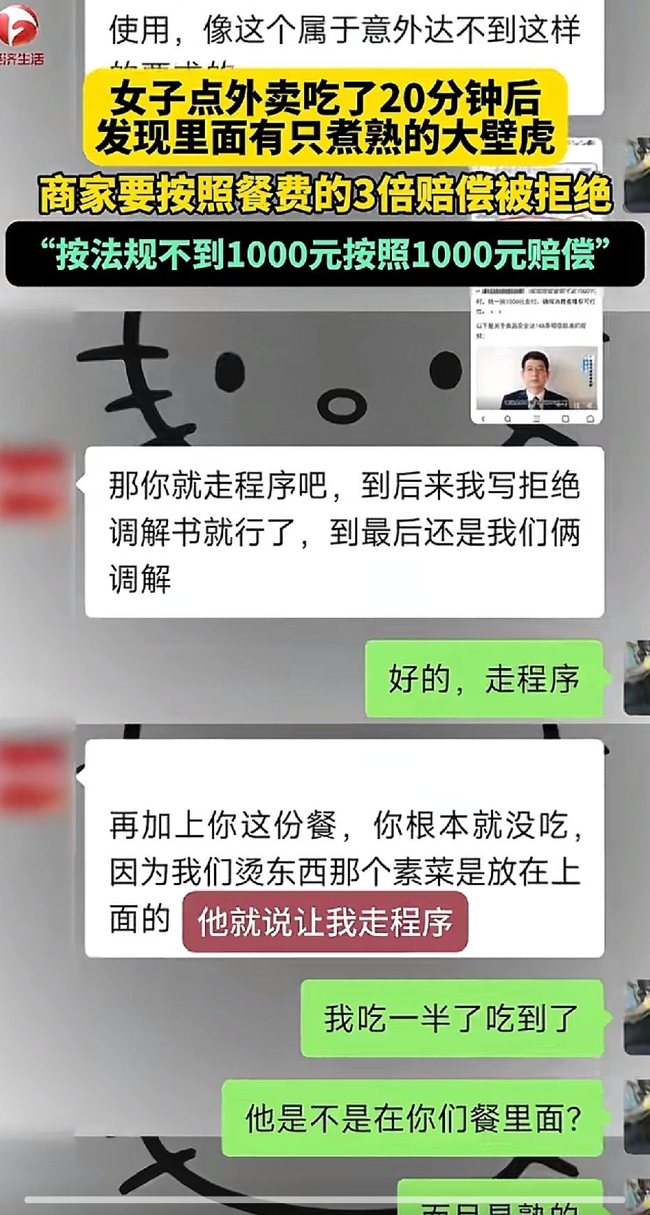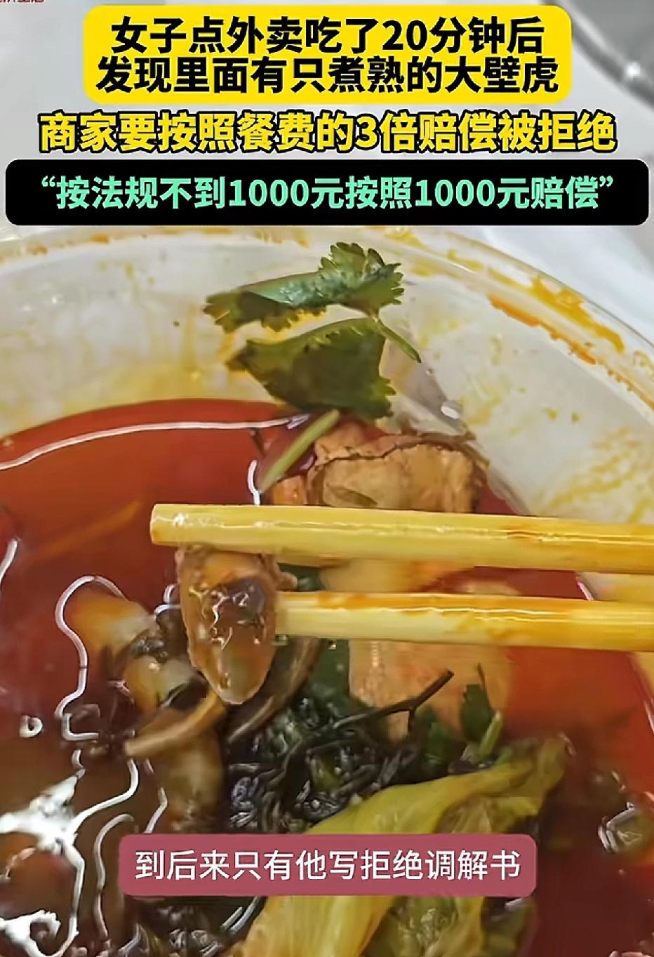 江西九江,一名女子在外卖中吃出一只壁虎,要求店家赔偿1000元,然而店家仅愿给予