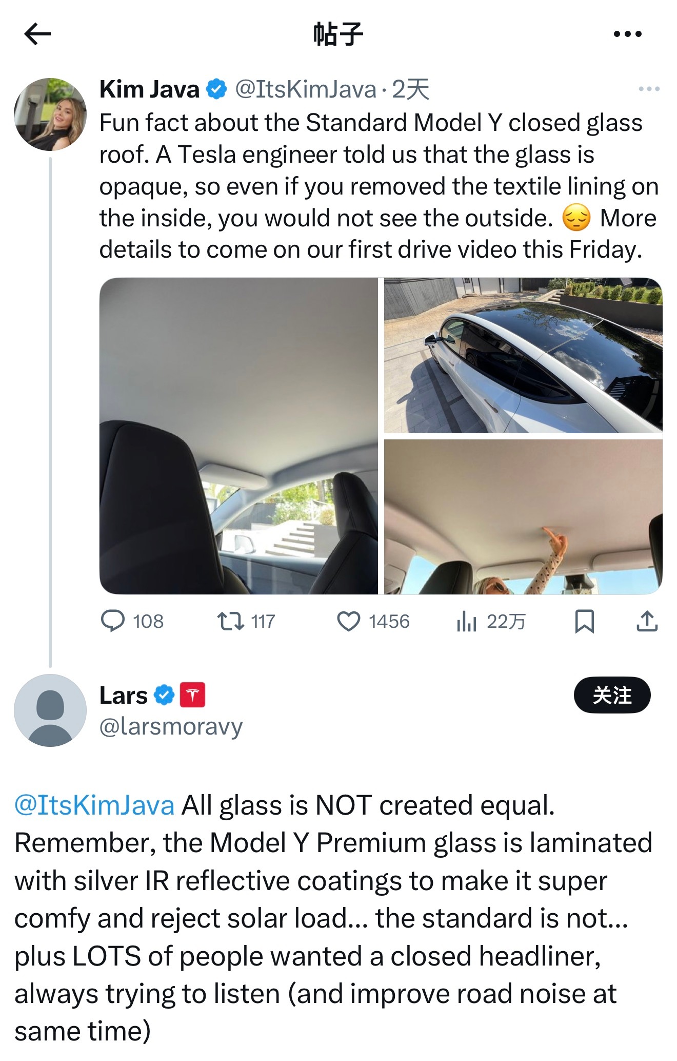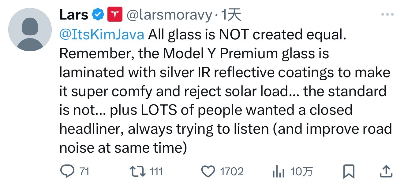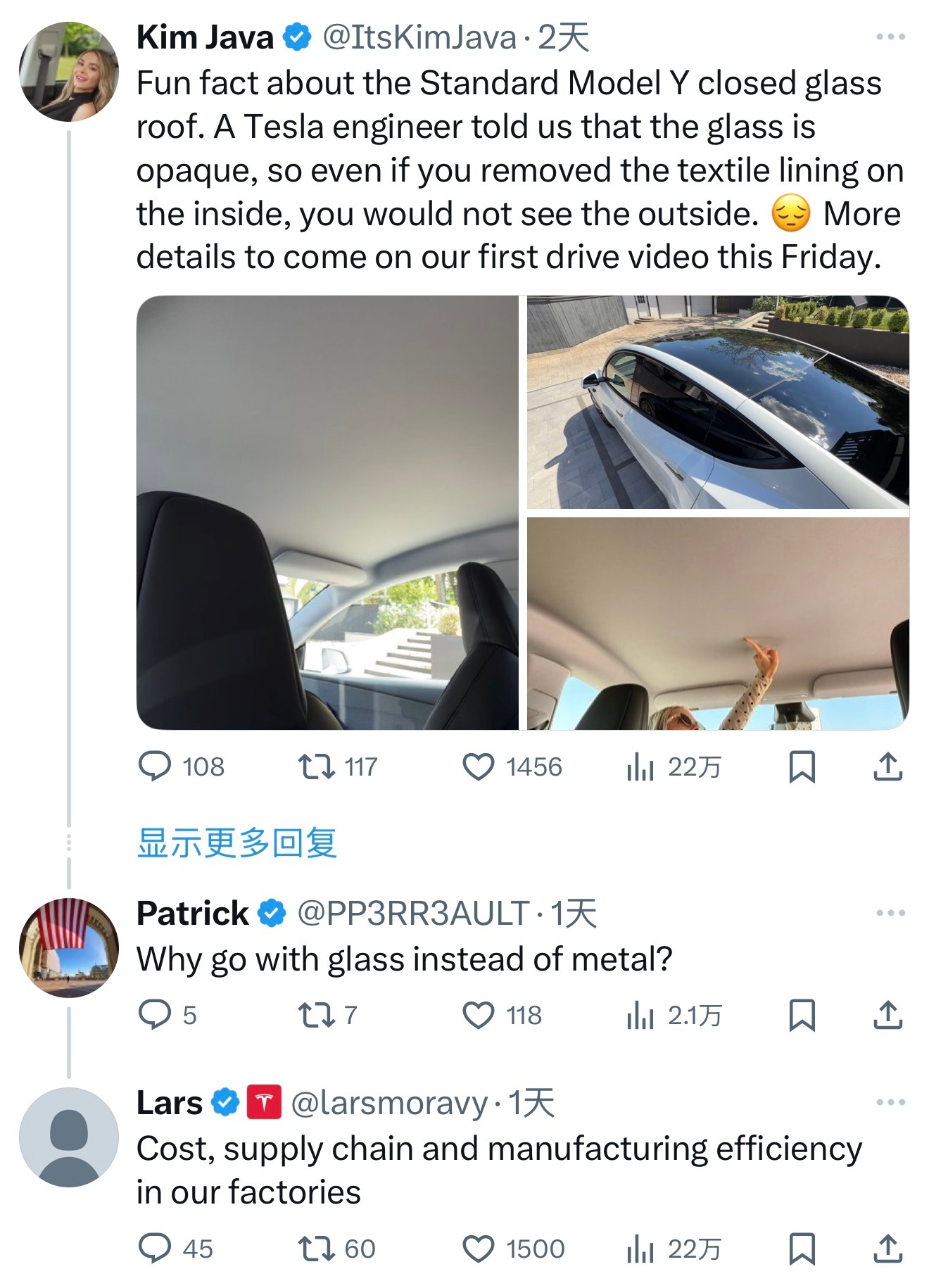 补充一些简配特斯拉ModelY的信息:原博作者指出:“特斯拉的工程师说,这块玻