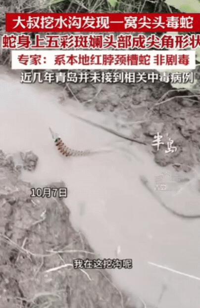 “幸亏跑得快!”10月10日报道,青岛一大叔挖水沟,一铲子下去,竟然从土里钻出来一条“大长虫”,还有一窝尖头毒蛇,蛇身上五彩斑斓,头部成尖角形状,确定是毒蛇!专家表示:系本地红脖颈槽蛇,虽然是毒蛇,但毒性不是很强![舔屏] 青岛一位大叔在田地里挖水沟时,意外挖出一窝红脖颈槽蛇,这种蛇已被列入国家“三有”保护动物名录,擅自捕杀可能面临法律处罚。 大叔在挖到半米深时,铁锹触碰到一条成年蛇,这条蛇直径约5—6厘米,身体呈红褐色,脖颈部有明显红色斑块,头部呈三角形,受惊后,蛇迅速从土坑中爬出,坑内还有数条幼蛇。 大叔拍摄视频后发到网上求助,有人称这是“野鸡脖子”,民间认为有毒性,专家随后确认为红脖颈槽蛇,属于后沟牙毒蛇,毒腺位于口腔后部。 这种蛇的毒液需要通过咀嚼动作才能注入,且毒性相对较弱,通常不会主动攻击人,但部分网友质疑“毒性较弱”的说法,认为只要有毒就应该警惕,被咬后可能出现局部肿胀、疼痛等症状,建议及时就医。 红脖颈槽蛇在山东沿海地区分布较广,主要栖息在农田、山坡和水域附近,它们以蛙类、小型啮齿动物为食,在控制农田鼠害方面发挥作用。 红脖颈槽蛇属于“三有”保护动物,即有重要生态、科学、社会价值的陆生野生动物,非法捕杀一条可处2000—10000元罚款。 如果涉及多条或情节严重,可能构成非法猎捕珍贵、濒危野生动物罪,面临刑事处罚,2021年,烟台一男子因捕杀7条红脖颈槽蛇,被判处有期徒刑六个月,缓刑一年,并处罚金3000元。 这起事件引发讨论的核心在于,有毒动物与法律保护的双重属性,一方面要保护人身安全,另一方面要遵守野生动物保护法规。 实际处理建议是,发现蛇类后保持2米以上距离,不要试图驱赶或攻击,可以拍照记录后联系当地林业部门或野生动物救助站,由专业人员处理。 青岛大叔的做法值得参考,发现后立即后退,保持安全距离,拍摄视频求助,没有采取驱赶或击打行为,这既避免了被咬伤的风险,也没有触犯法律。 网友热评: “青岛大叔这波操作太刺激了!挖个水沟直接挖出个'蛇窝',还是带毒的!幸亏没被咬,不然得吓出心脏病!” “专家说毒性不强?可那蛇脑袋尖尖的,看着就像电视剧里的毒蛇!还是离远点吧,宁可信其有!” “现在挖地都这么危险了?以后干农活得先请个'探蛇师'啊!” “红脖颈槽蛇?这不就是'野鸡脖子'吗?小时候听老人说这种蛇会追人,被咬了会流血不止,吓得我田都不敢下!” “法律还管蛇?难怪网上总说'三有动物碰不得',这大叔运气真好,没被罚款!” “建议青岛农村家家户户发个'蛇类图鉴',挖水沟前先对照着看!” 如果挖水沟时真遇到毒蛇,你会选择悄悄溜走,还是拍照发网上求鉴定?评论区晒出你的'防蛇攻略'! 信源:纵览新闻